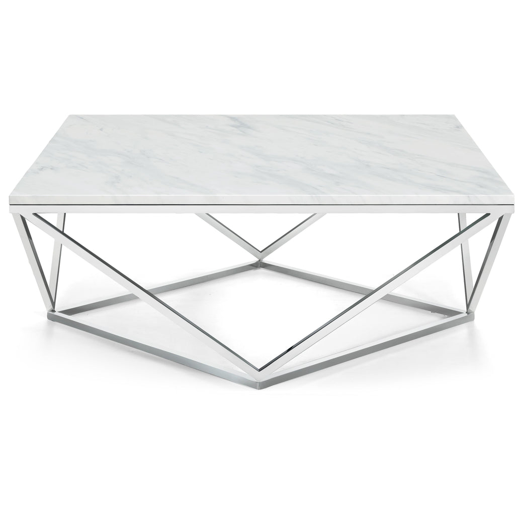 Keep the modern vibe going with this Skyler stainless steel coffee table from Meridian Furniture. This coffee table features architectural bases with a sculptural design that's chic and contemporary. The tops of each table feature solid stone tops for durability and remarkable style.