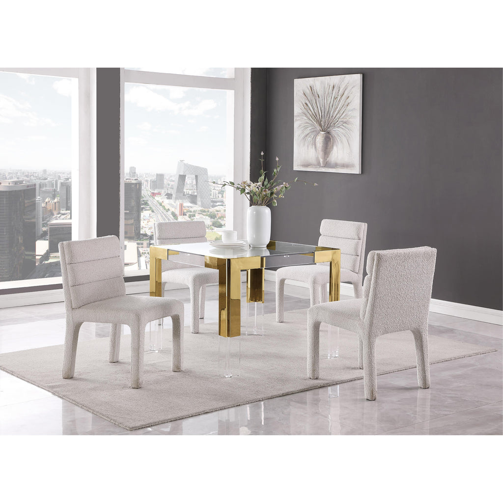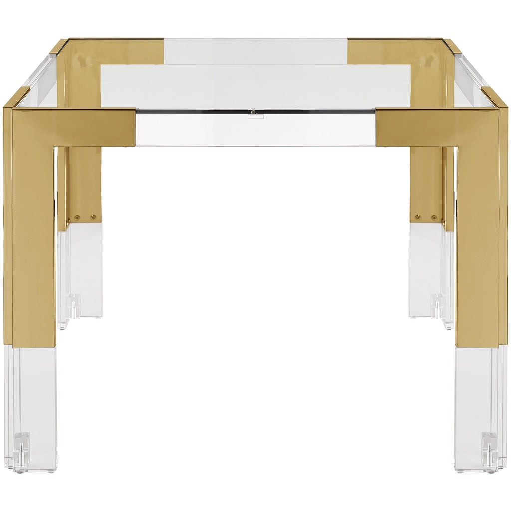 Enjoy intimate meals with those you love when you gather around this Casper dining table. This beautifully eye-catching table features a rich gold frame topped with a clear glass top for a rich, luxe look. Acrylic legs crown the gold stainless steel frame, adding to its contemporary feel. Pair it with your favorite modern chairs for an instant dining room or breakfast nook facelift.