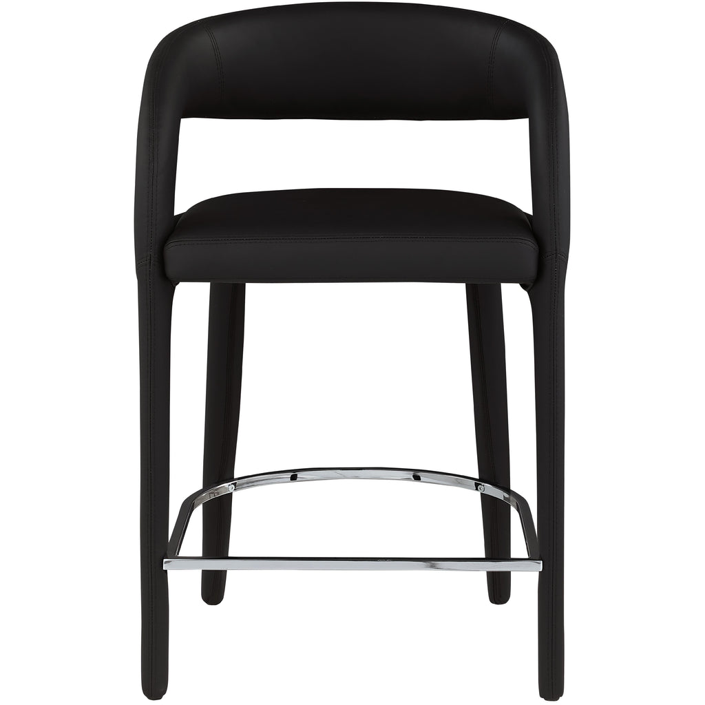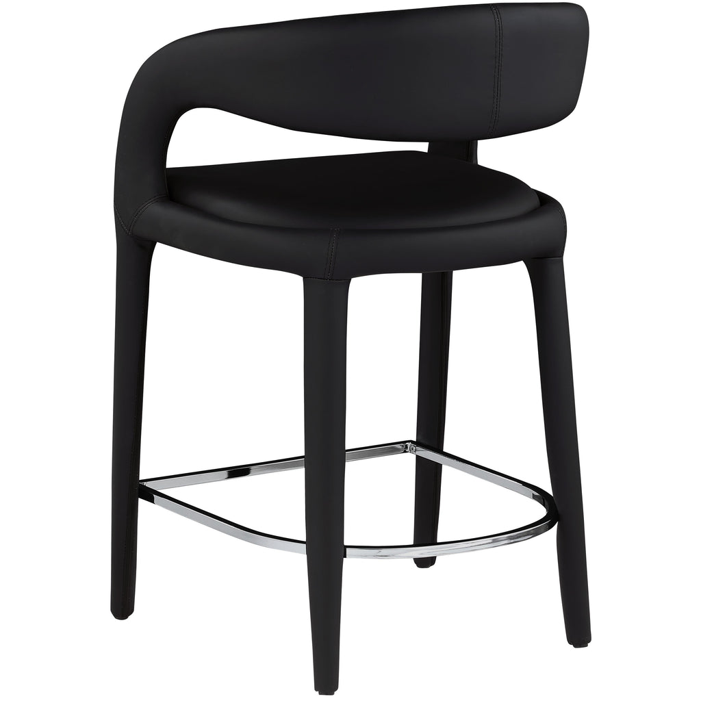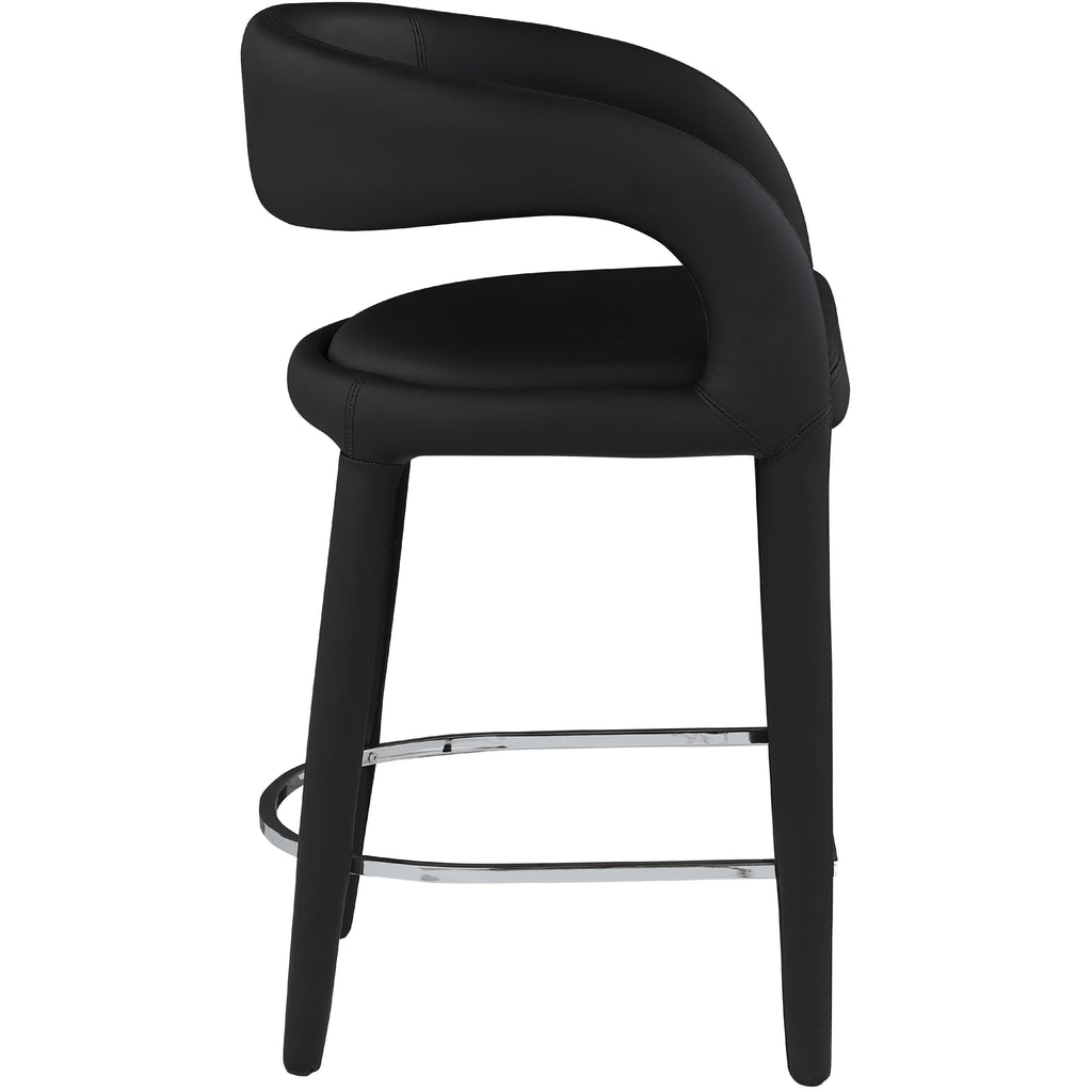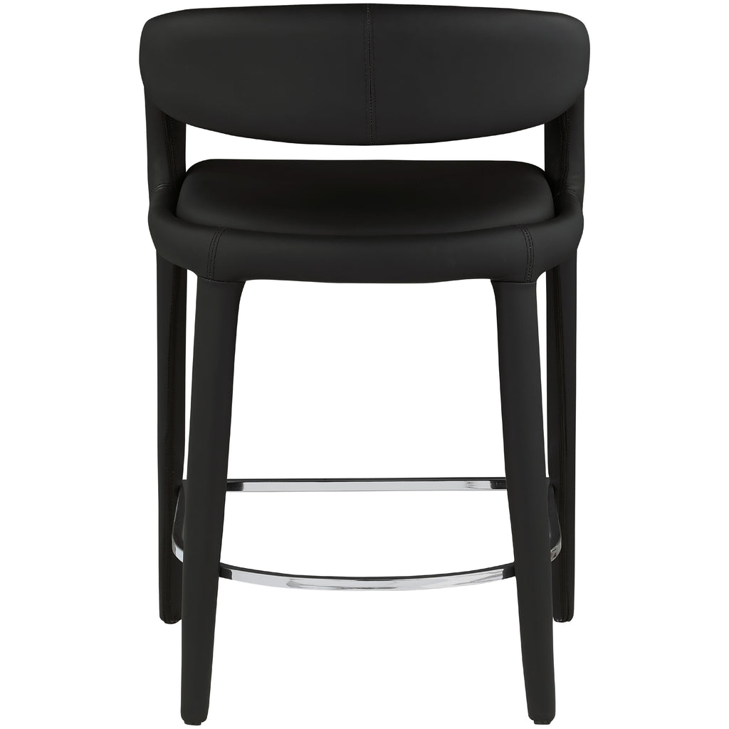 Modernize your home with this Sylvester black vegan leather stool. Featuring soft and durable black vegan leather upholstery, this stool offers you a comfortable and long-lasting place to sit while you dine. It's fully upholstered, giving it a solid look that is ideal for any contemporary home. Its rounded back provides upper back support, while its semi-open design makes a fashionable decorative statement that is sure to catch the eyes of anyone who joins you for dinner.
