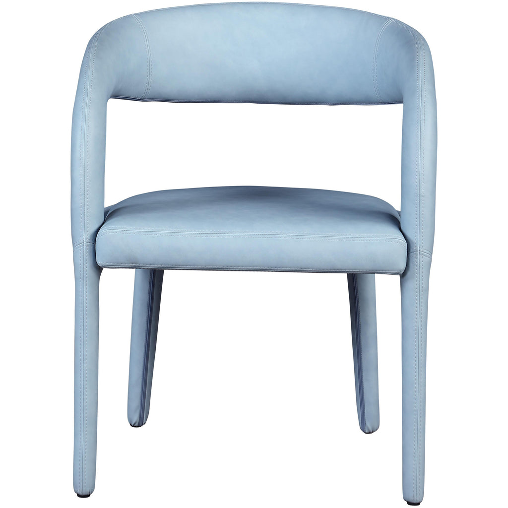 Modernize your home with this Sylvester light blue vegan leather dining chair. Featuring soft and durable light blue vegan leather upholstery, this chair offers you a comfortable and long-lasting place to sit while you dine. It's fully upholstered, giving it a solid look that is ideal for any contemporary home. Its rounded back provides upper back support, while its semi-open design makes a fashionable decorative statement that is sure to catch the eyes of anyone who joins you for dinner.