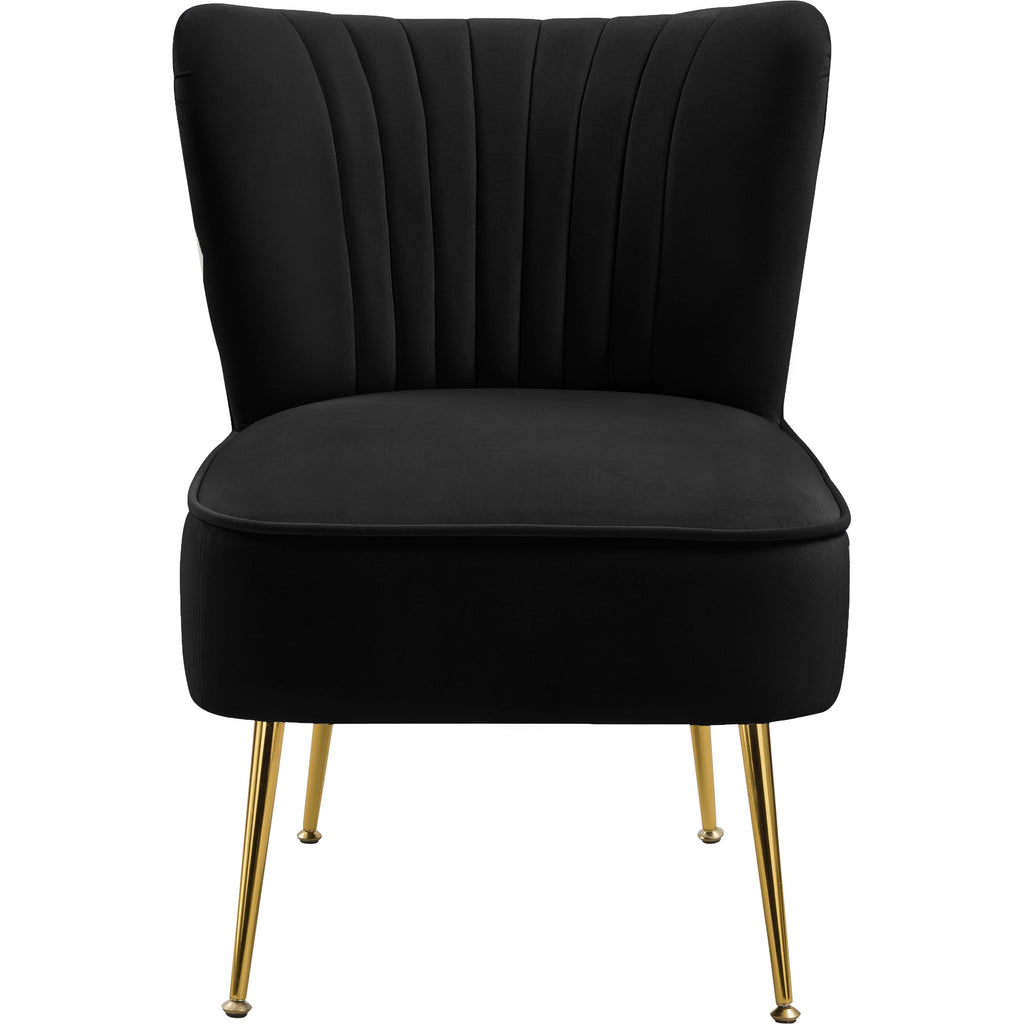 Bring home this Tess velvet accent chair to give them something to talk about. This handsome chair will be the talk of the town with its soft black velvet upholstery that's sleek and comfortable against the skin. Deep channel tufting along the back of the chair adds to its upscale look, and gold steel legs ensure the chair's a good fit with contemporary decor.