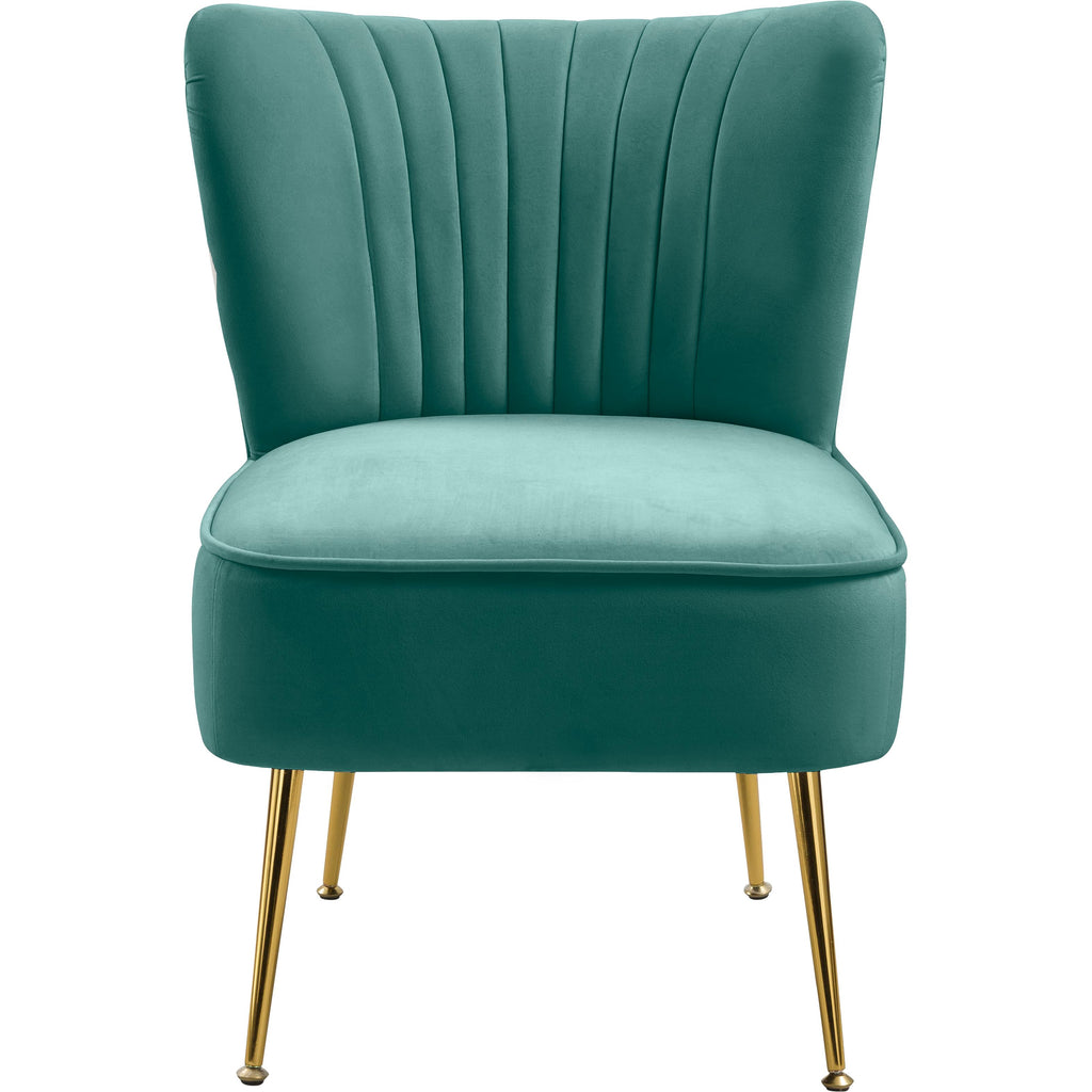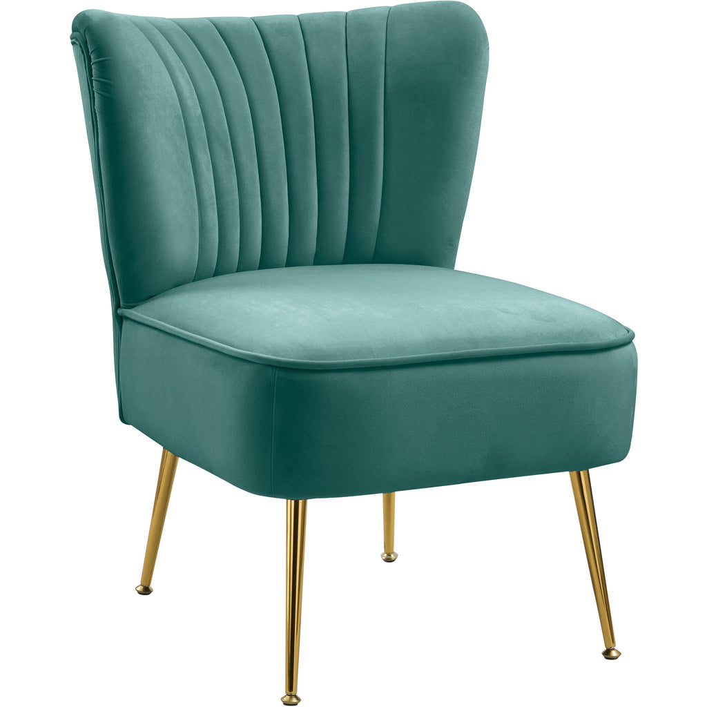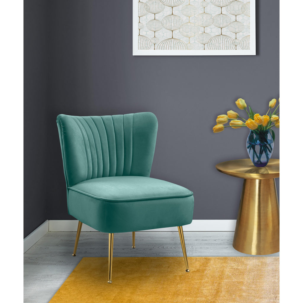 Bring home this Tess velvet accent chair to give them something to talk about. This handsome chair will be the talk of the town with its soft mint velvet upholstery that's sleek and comfortable against the skin. Deep channel tufting along the back of the chair adds to its upscale look, and gold steel legs ensure the chair's a good fit with contemporary decor.