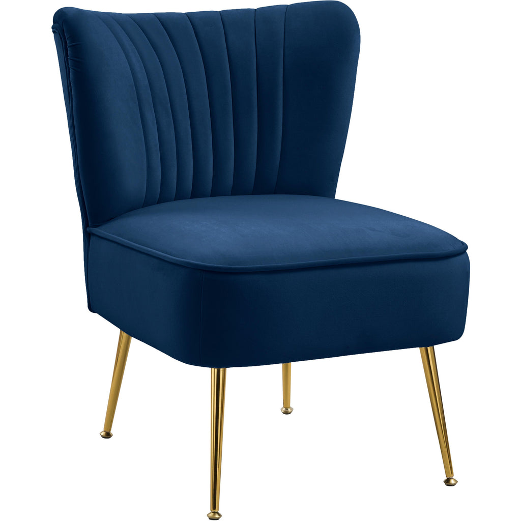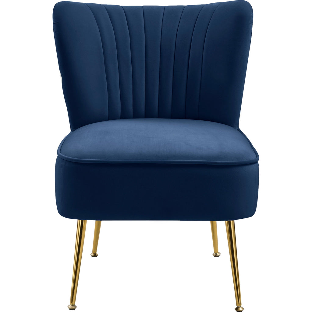 Bring home this Tess velvet accent chair to give them something to talk about. This handsome chair will be the talk of the town with its navy velvet upholstery that's sleek and comfortable against the skin. Deep channel tufting along the back of the chair adds to its upscale look, and gold steel legs ensure the chair's a good fit with contemporary decor.