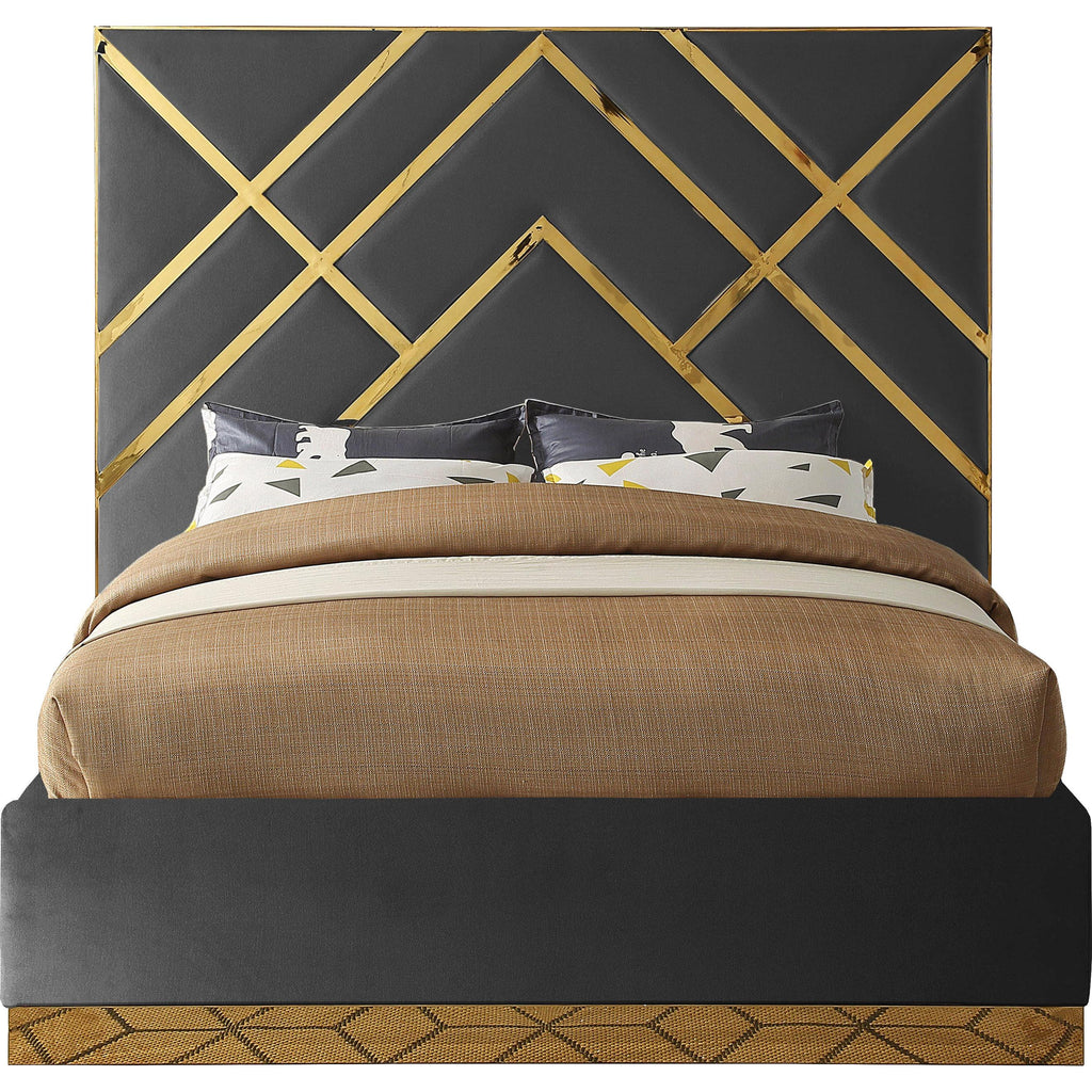 Take your bedroom space to a whole new modern level with this Vector grey velvet queen bed. Posh velvet upholstery in a lovely grey color is intersected by polished gold metal in a geometric design that is nothing short of spectacular. This stunning bed has a gold metal base to finish off the presentation on a glamorous and upscale note. Full slats are included with the bed to help provide support for your mattress, and the platform footprint ensures you need no box springs or foundation to recreate this look at home.