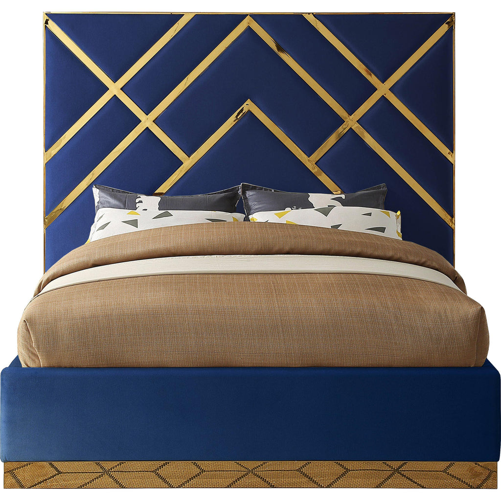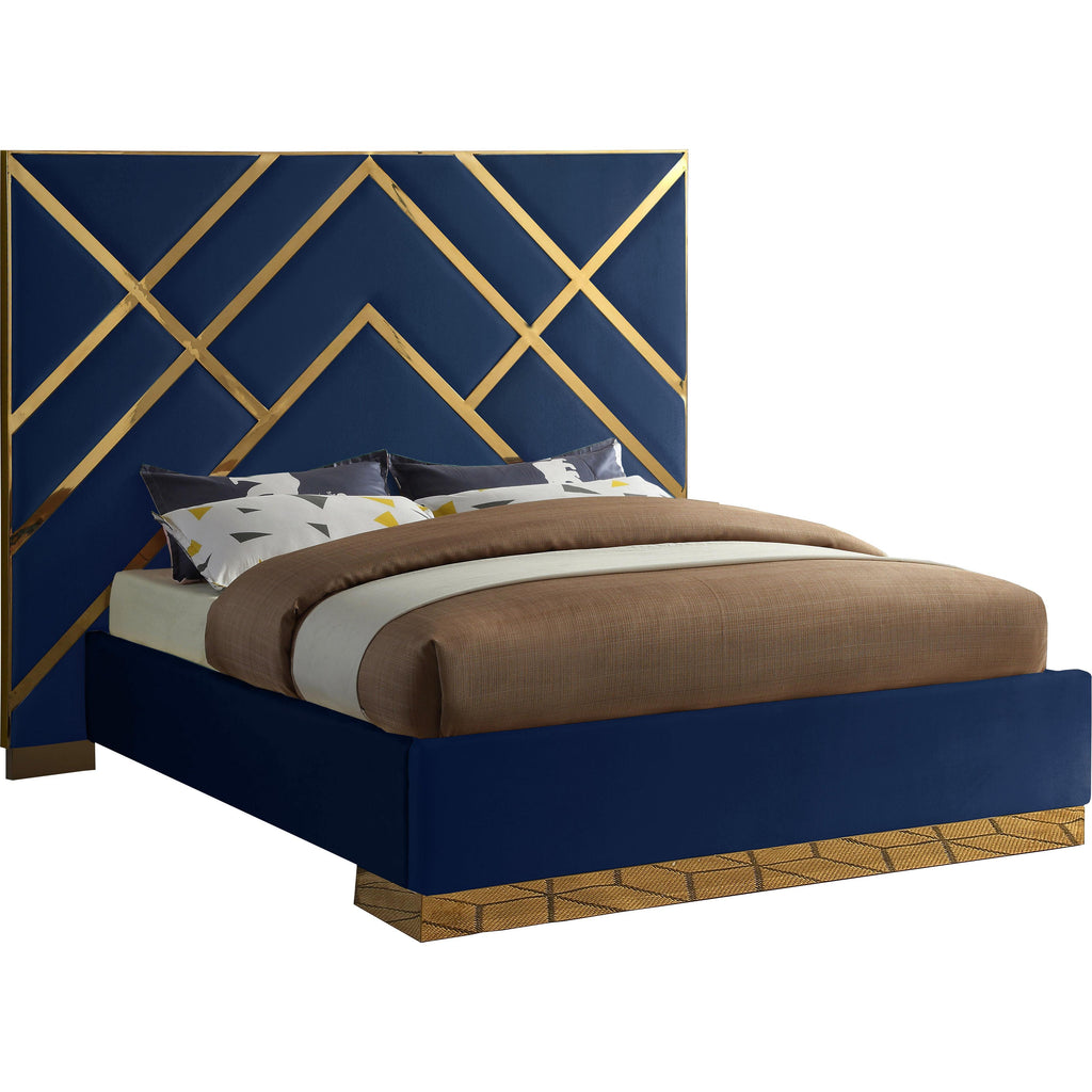 Take your bedroom space to a whole new modern level with this Vector navy velvet queen bed. Posh velvet upholstery in a lovely navy color is intersected by polished gold metal in a geometric design that is nothing short of spectacular. This stunning bed has a gold metal base to finish off the presentation on a glamorous and upscale note. Full slats are included with the bed to help provide support for your mattress, and the platform footprint ensures you need no box springs or foundation to recreate this look at home.