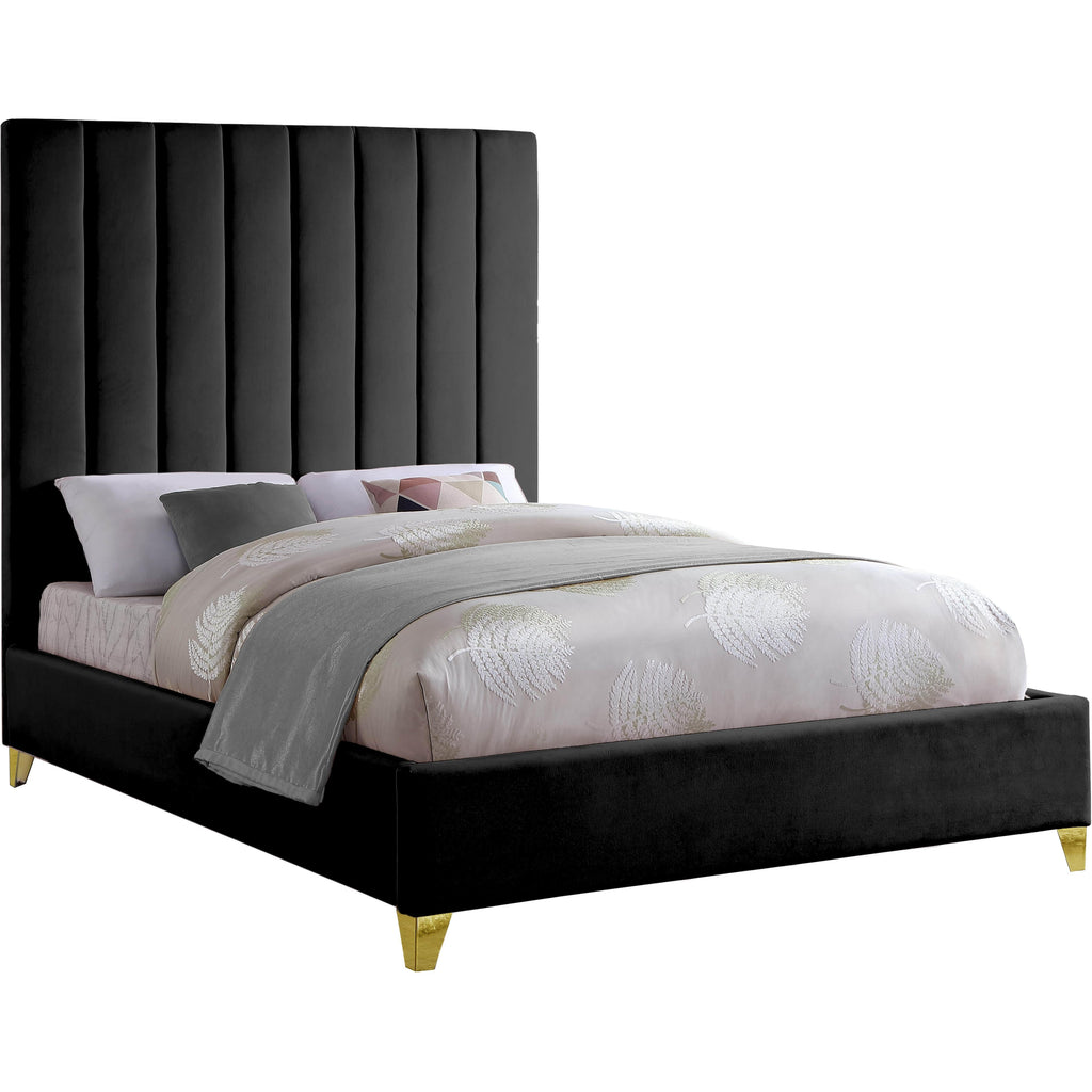 Take the look of your bedroom to new decorative heights with this ultra-modern Via queen-sized upholstered bed. Sleek black velvet upholstery gives this bed a true upscale feel and epitomizes fine living while channel tufting along the headboard keeps the padded material inside plump and it also cradles your body while you sit up in bed to watch TV or read. Metal legs bring this platform bed up off the floor, allowing clearance below for cleaning and adding to its svelte contemporary profile.