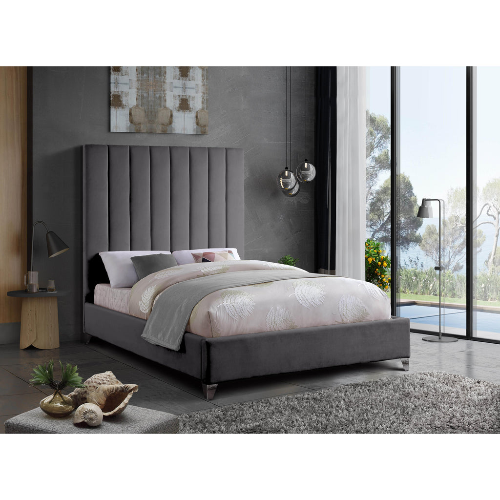 Take the look of your bedroom to new decorative heights with this ultra-modern Via upholstered queen bed. Rich grey velvet upholstery gives this bed a true upscale feel and epitomizes fine living while channel tufting along the headboard keeps the padded material inside plump and it also cradles your body while you sit up in bed to watch TV or read. Metal legs bring this platform bed up off the floor, allowing clearance below for cleaning and adding to its svelte contemporary profile.