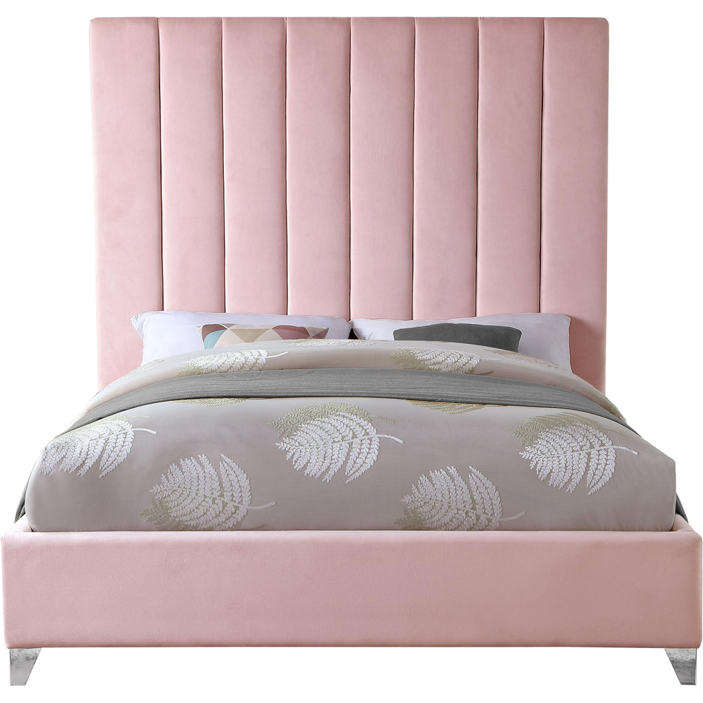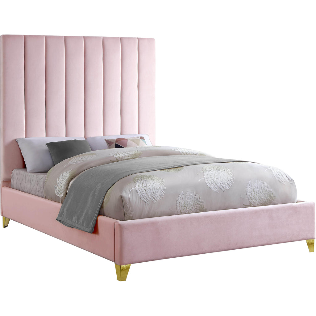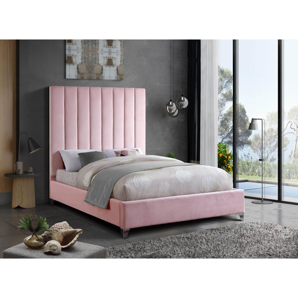 Take the look of your bedroom to new decorative heights with this ultra-modern Via upholstered queen bed. Rich pink velvet upholstery gives this bed a true upscale feel and epitomizes fine living while channel tufting along the headboard keeps the padded material inside plump and it also cradles your body while you sit up in bed to watch TV or read. Metal legs bring this platform bed up off the floor, allowing clearance below for cleaning and adding to its svelte contemporary profile.