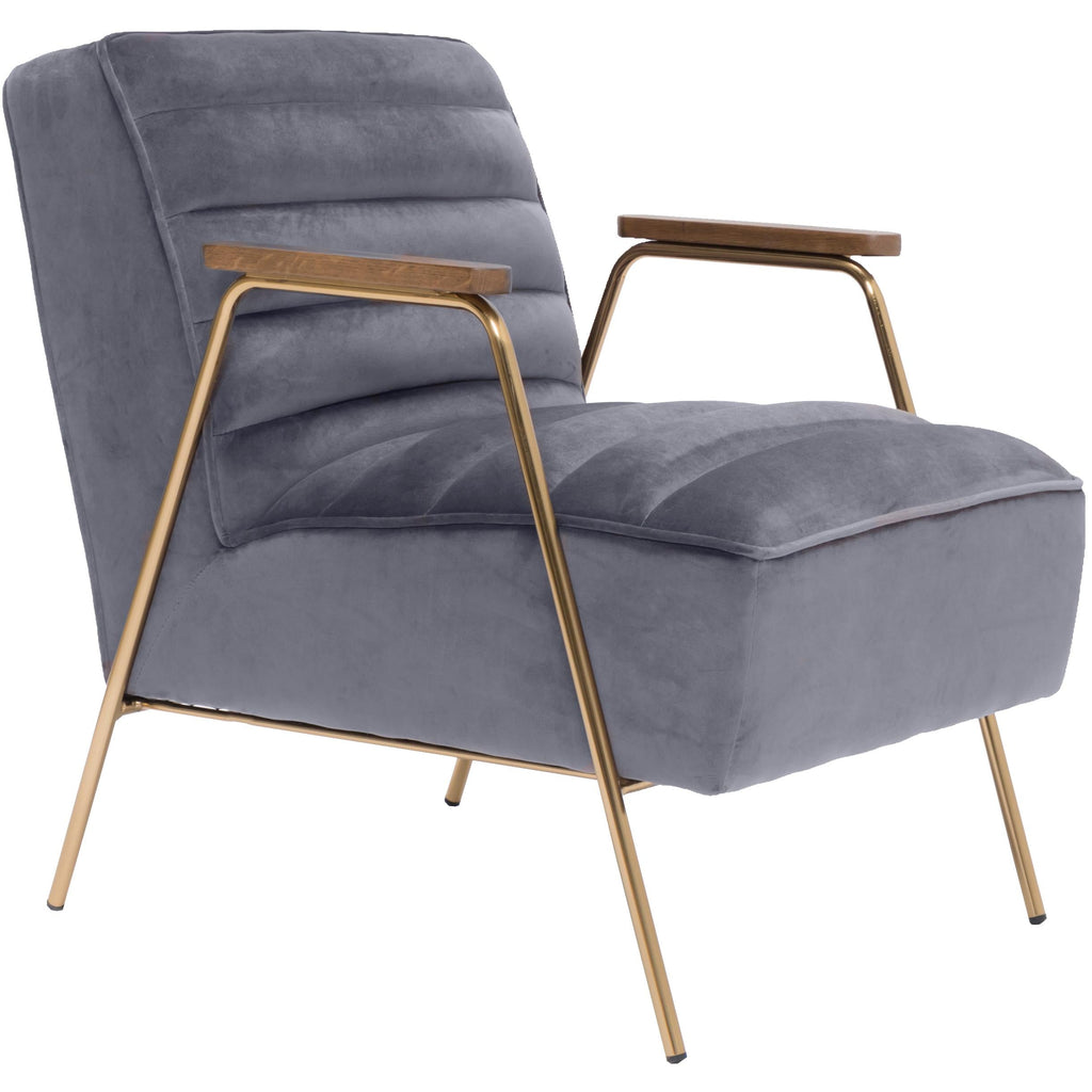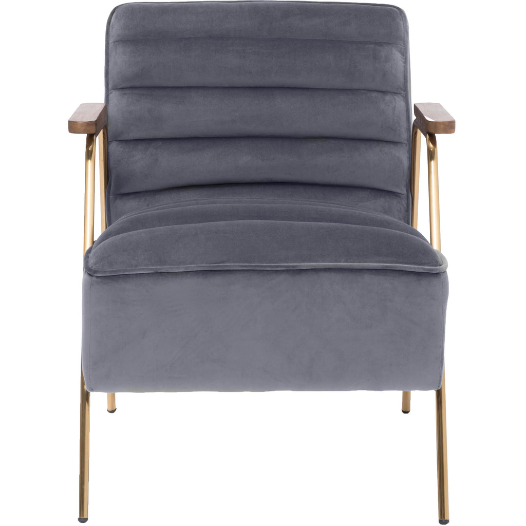 Go mod in your living room, den or other space with this Woodford velvet accent chair. This lovely addition to your home features soft grey velvet upholstery for a lavish look in any room. The back and seat are channel tufted for added resilience and lasting beauty. The metal frame adds enduring quality to this chair, and the brushed gold metal legs and wood arms lend it a definitive contemporary vibe.
