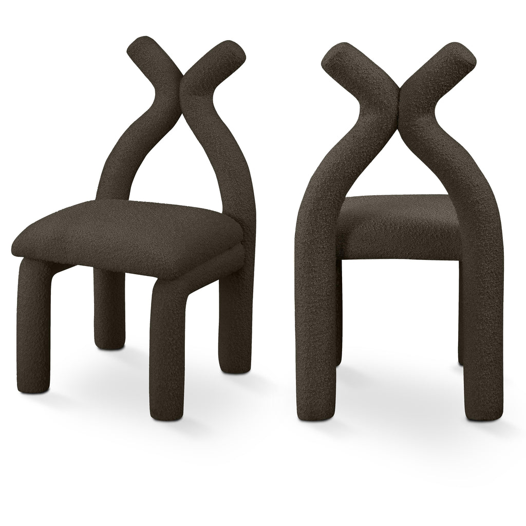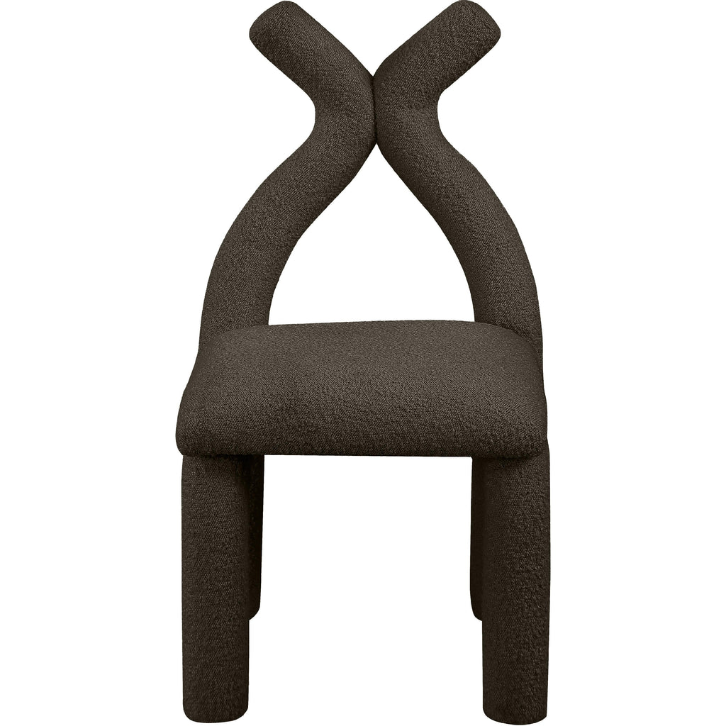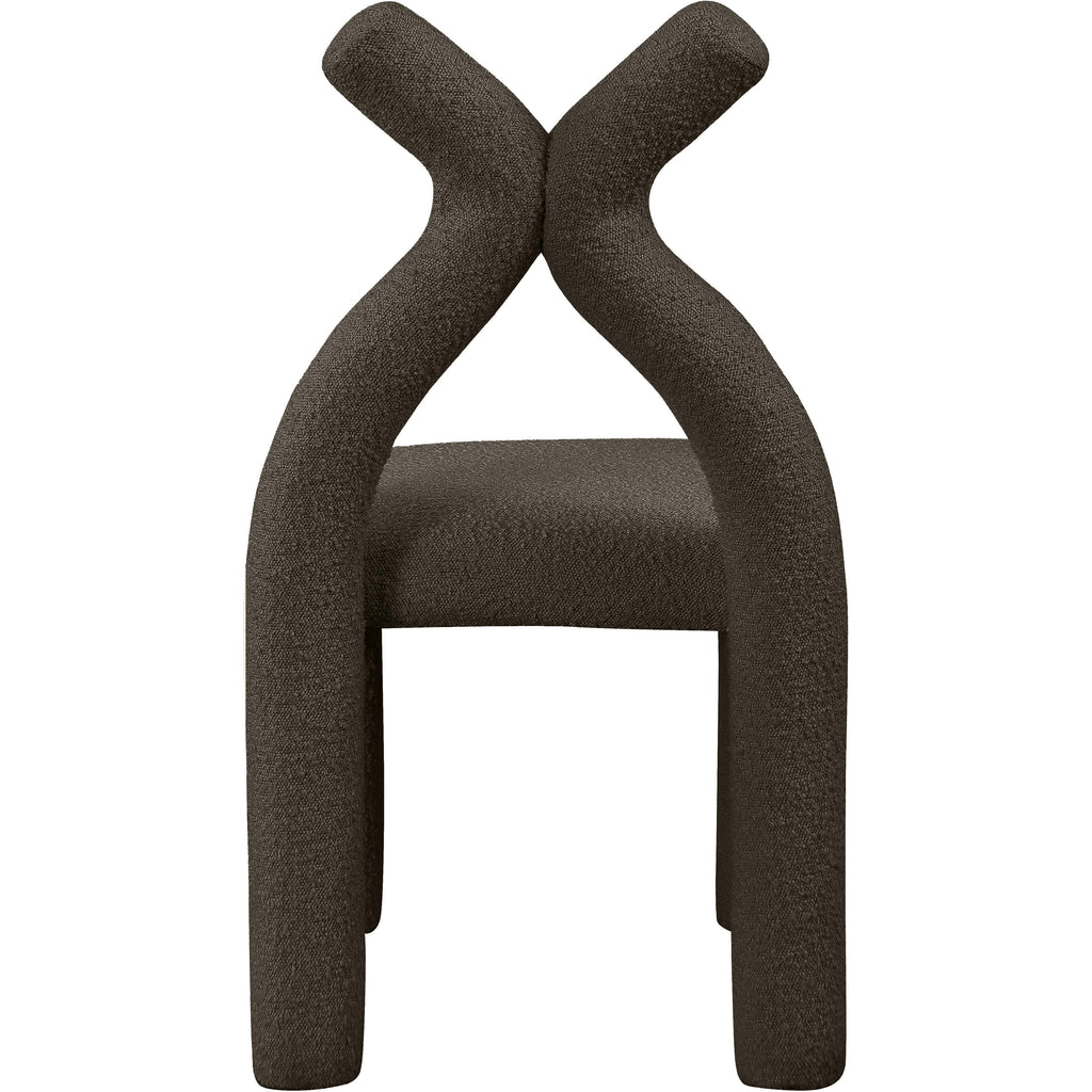 Make a bold statement in your home's decor with the striking Xena Boucle Fabric Accent/Dining Chair. The luxurious brown boucle fabric paired with the solid wood inner frame not only exudes comfort and durability but also adds a touch of sophistication to your living space. Its unique and artful design is bound to captivate the eyes of anyone who enters your home.