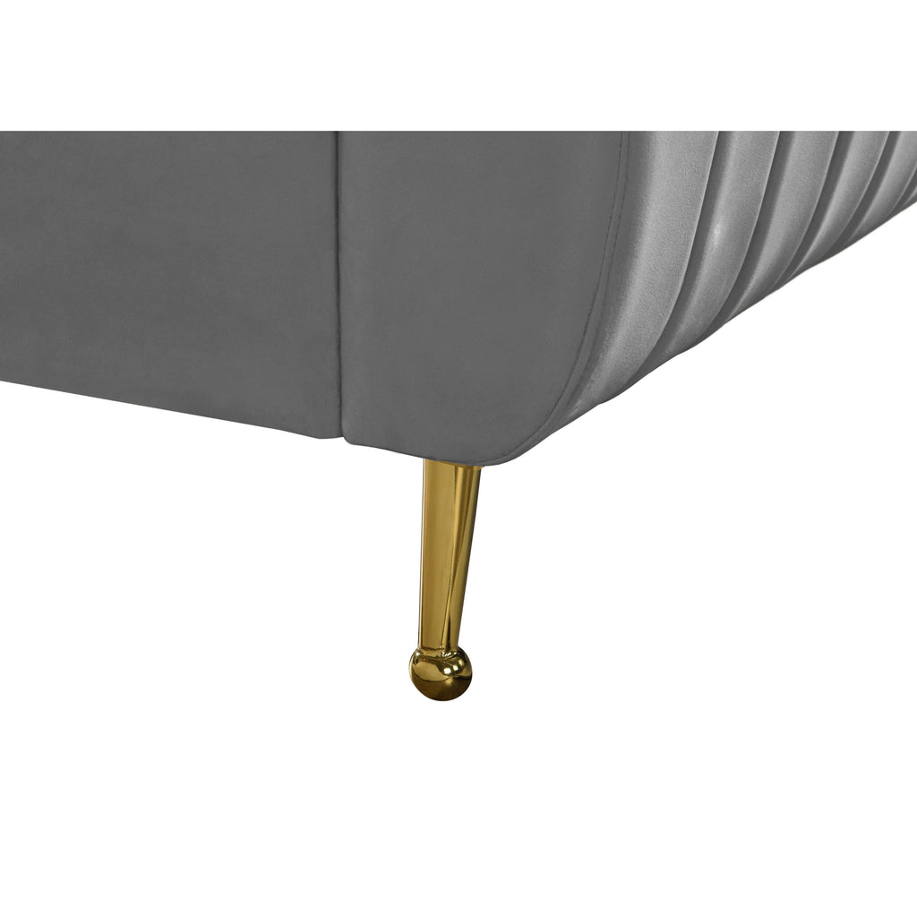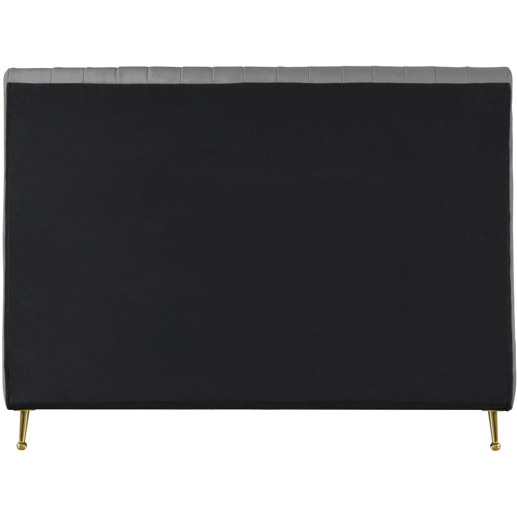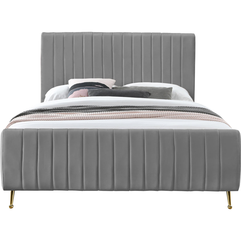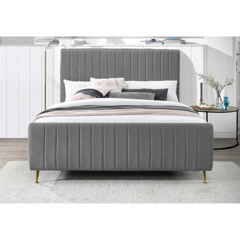 Slip into the lap of luxury with this Zara Velvet Bed. This beautiful queen bed is padded to the max on its headboard and footboard for a look that is nothing short of upscale. The luxe design is amplified by the bed's rich grey velvet upholstery and its deep detailed channel tufting, which also serves to keep the interior padding aloft, full, and comfortable while you relax or unwind in bed. The bed has gold legs for a regal touch, and it comes with slats, so it doesn't require a box spring.