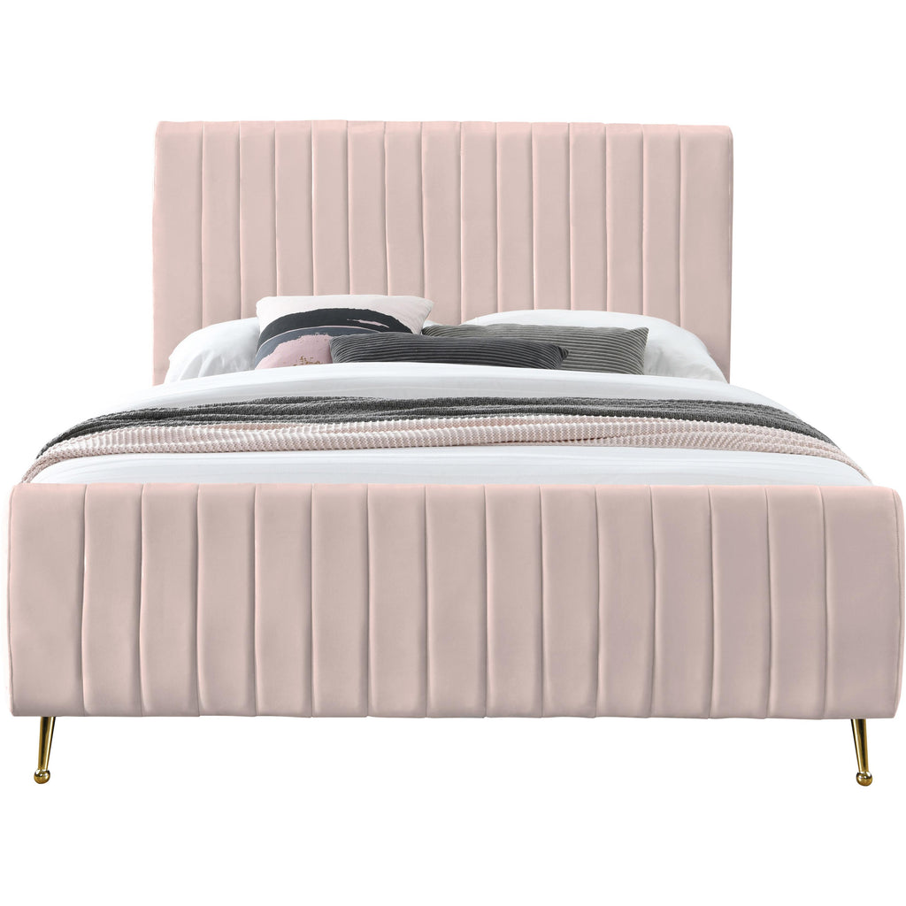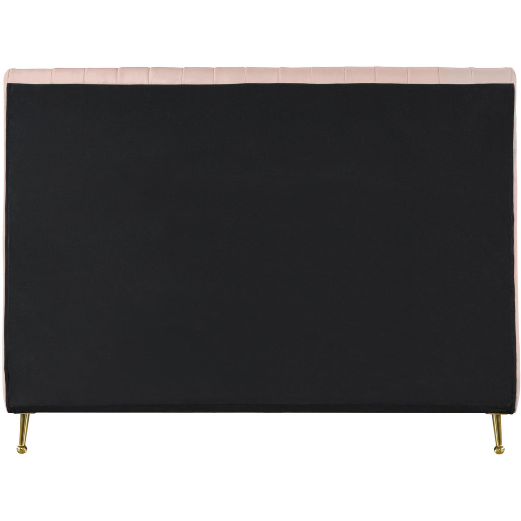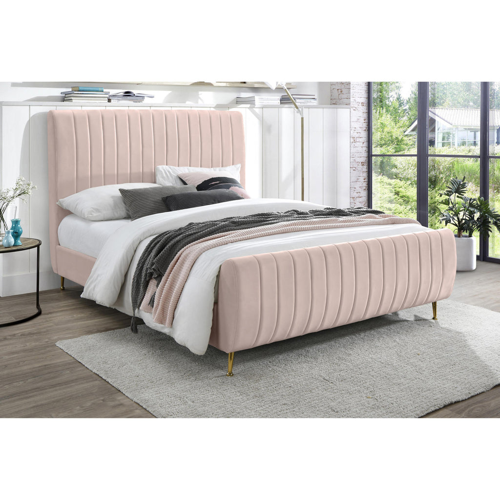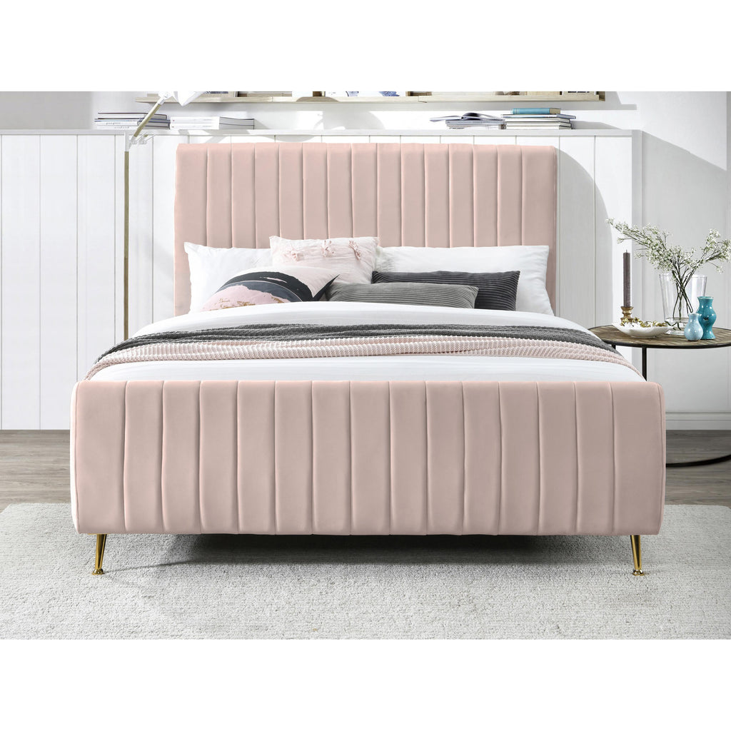 Slip into the lap of luxury with this Zara Velvet Bed. This beautiful queen bed is padded to the max on its headboard and footboard for a look that is nothing short of upscale. The luxe design is amplified by the bed's rich pink velvet upholstery and its deep detailed channel tufting, which also serves to keep the interior padding aloft, full, and comfortable while you relax or unwind in bed. The bed has gold legs for a regal touch, and it comes with slats, so it doesn't require a box spring.