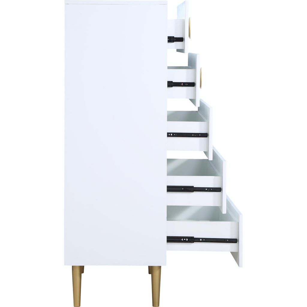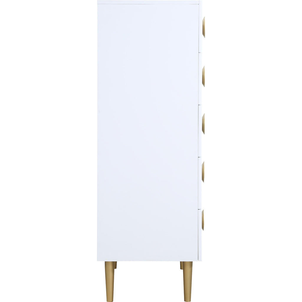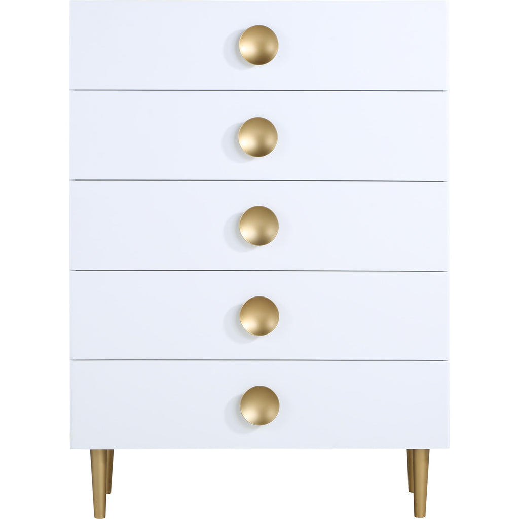 Watch your decor cascade to new heights when you bring home this Zayne chest. It features a rich white finish that sets an instant contemporary vibe in your space. Its brushed gold metal legs and handle add a sophisticated slant to the piece's design, ensuring it's a simple and easy fit with other modern pieces. Pair this unit with other items in the Zayne collection for a seamless presentation in your room.