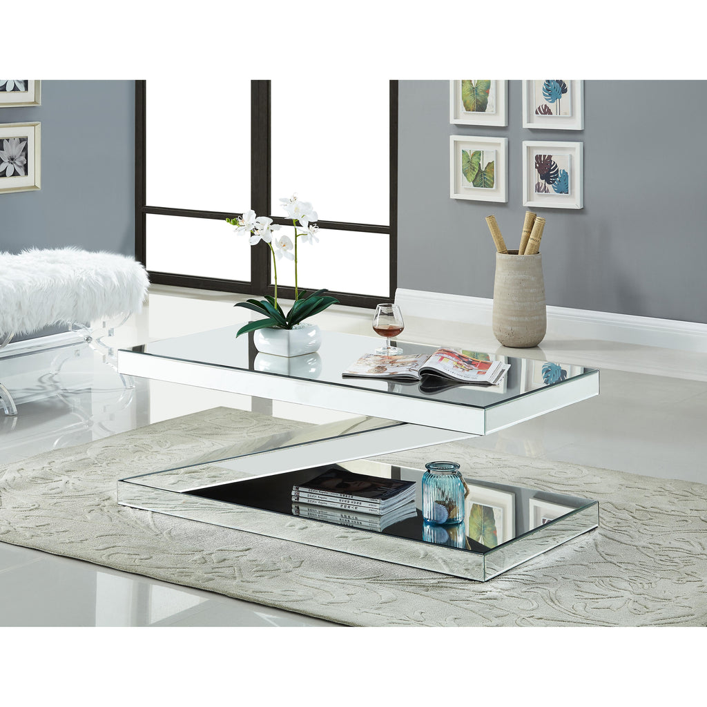 Create an instant focal point in your living room with this Zee coffee table from Meridian Furniture. This handsome table has a unique 'Z' design to catch the eye and garner compliments. The shape gives it a sculptural look, while the mirrored accents add dimension and airiness to your room. Use it on its own or alongside other items in the collection.