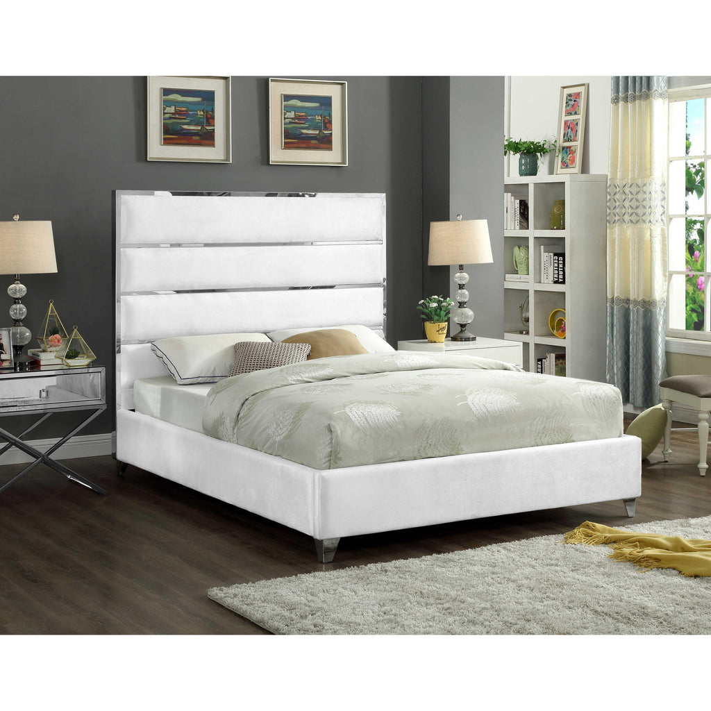 You'll fall fast and hard for the contemporary beauty of this Zuma White Velvet Queen Bed. The sleek velvet upholstery is not just supple and smooth to the touch - it also lends the bed an uber modern look from top to bottom. A chrome channel design draws the eye instantly to this fabulous bed, while chrome legs ensure the support it needs to support the mattress of your choice.