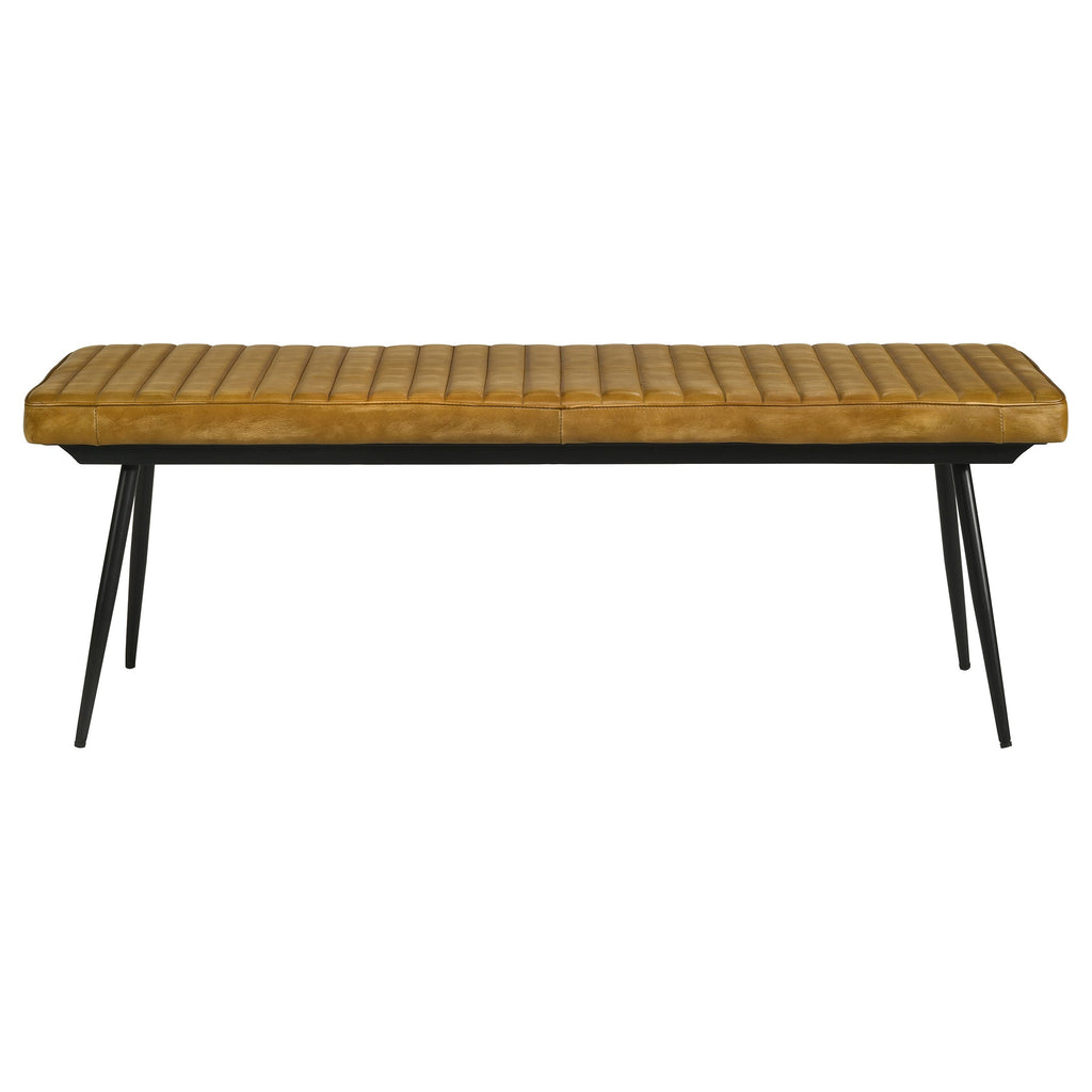 Blending rustic charm with industrial appeal, this dining bench is a bold yet versatile seating option. Upholstered in hand-dyed genuine goat leather, the padded seat with vertical tufting offers both comfort and durability. The sleek black metal base, featuring flared and tapered legs, provides a sturdy foundation with a modern edge. Designed to complement a variety of interiors, this bench is perfect for industrial, rustic, or contemporary dining spaces, offering both style and functionality.