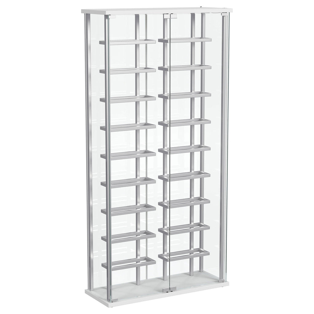 Put the spotlight - literally - on your favorite vintages with a modern bar cabinet. The glass cabinet is crystal clear with built-in LED lighting, offering bright, open flair in your dining room or home lounge. The cabinet features two glass doors with chrome hardware, offering a matching look to interior shelving. Shelves hold up to 18 of your favorite bottles of wine, showing them off to their best effect. The LED light is operated with a touch switch, making it simple and easy to highlight prized vintages.