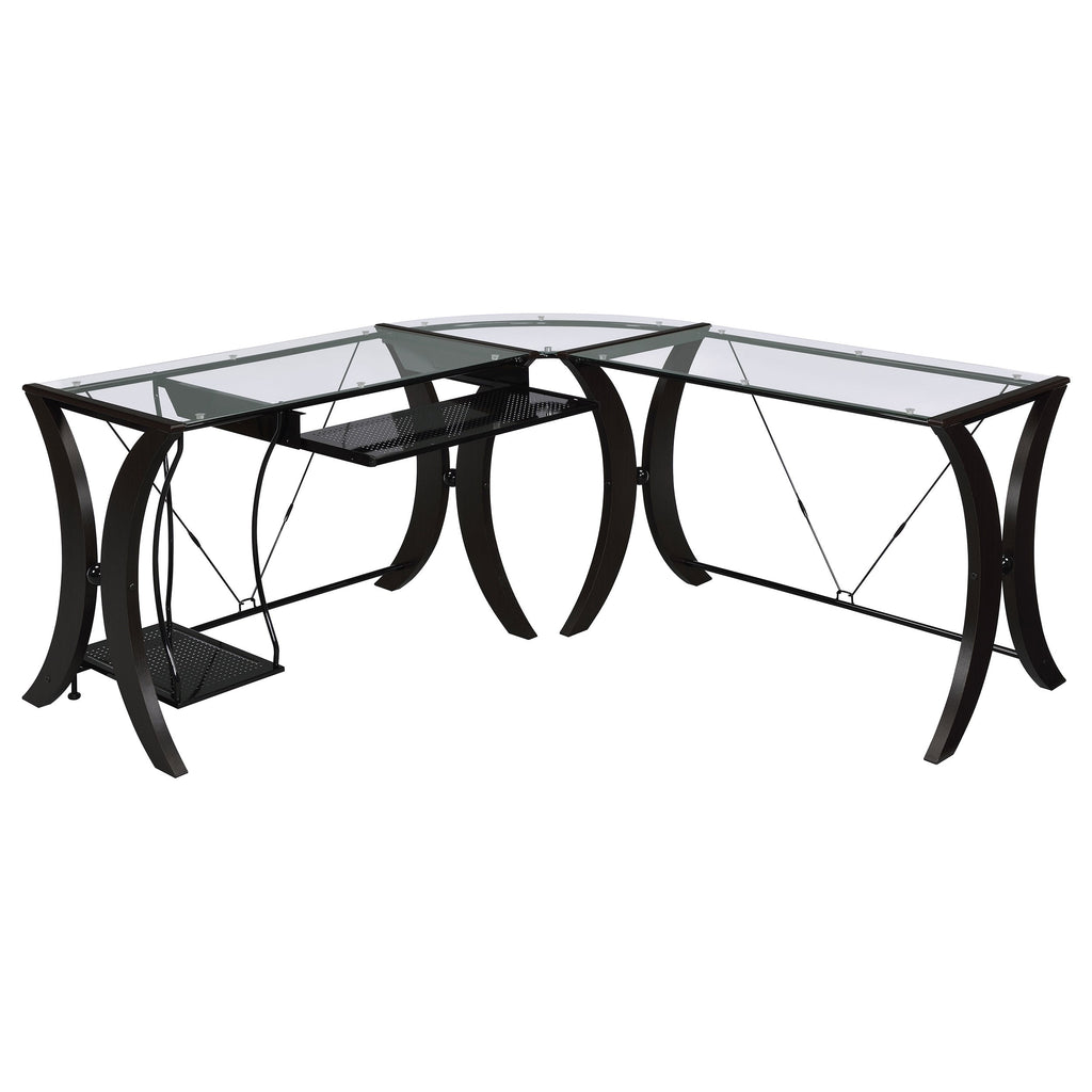This contemporary, three-piece computer desk is an effortless blend of glamour and functionality. Its base is composed of gracefully curved metal lines for a smooth, sleek silhouette. Finished in gorgeous shades of cappuccino and glossy black, it boasts a truly elegant look. A clear tempered glass top adds a pleasing touch of shine. This desk features a built-in CPU stand and keyboard drawer for your convenience.
