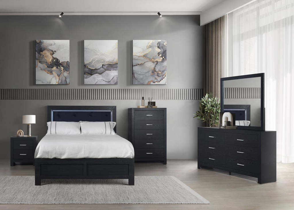A contemporary bedroom set featuring built-in LED lighting for a bold, modern look. The soft illumination adds a relaxing atmosphere while enhancing the room’s design. -