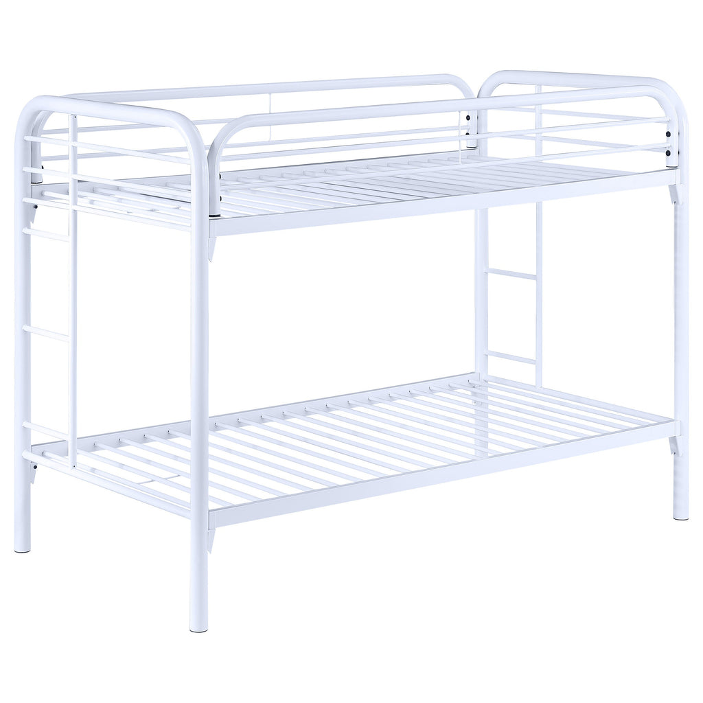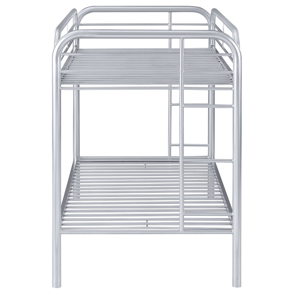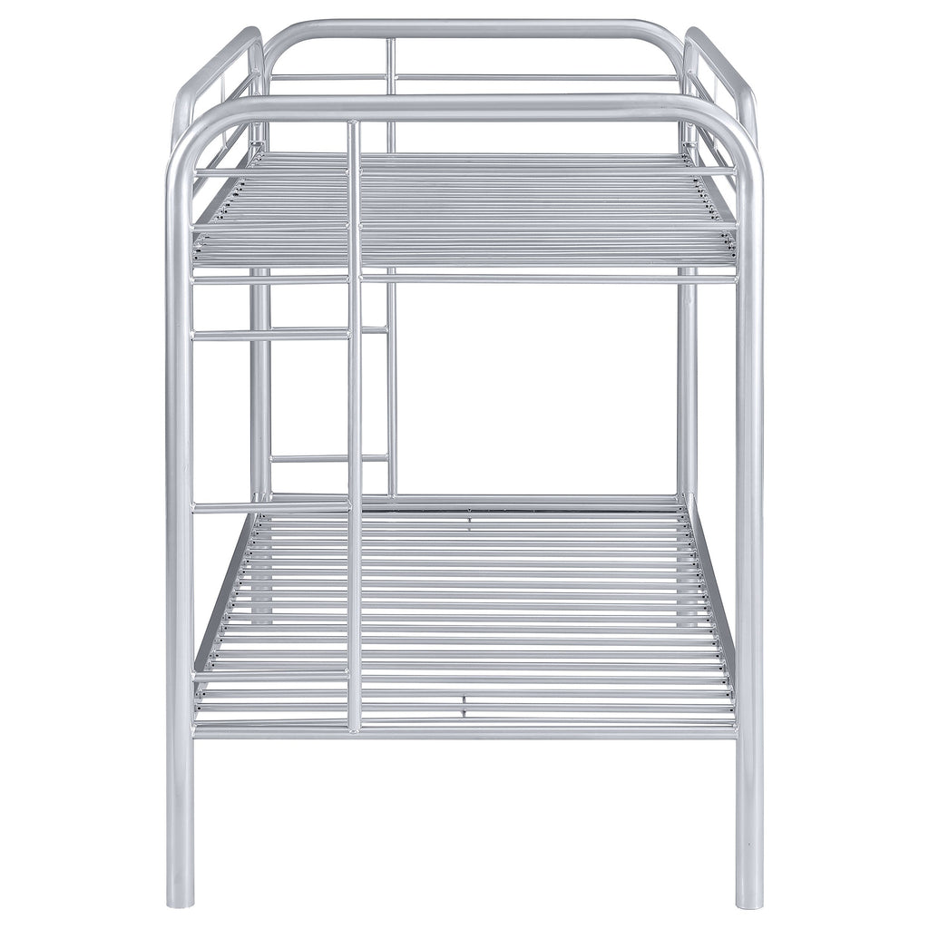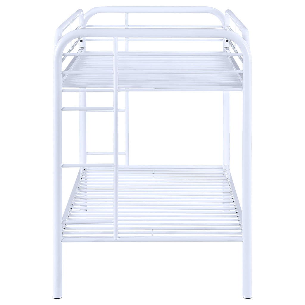 Crisp and clean, this twin bunk bed is full of sleek lines. Simplify a modern aesthetic in a small room with the built-in ladders on both sides of the frame. Open and supportive, the top bunk on this twin over twin bed features a full-length guard rail. Balance out thin and elongated metal lines with a sleek black finish. Complete a contemporary motif with modern colors and smooth features.