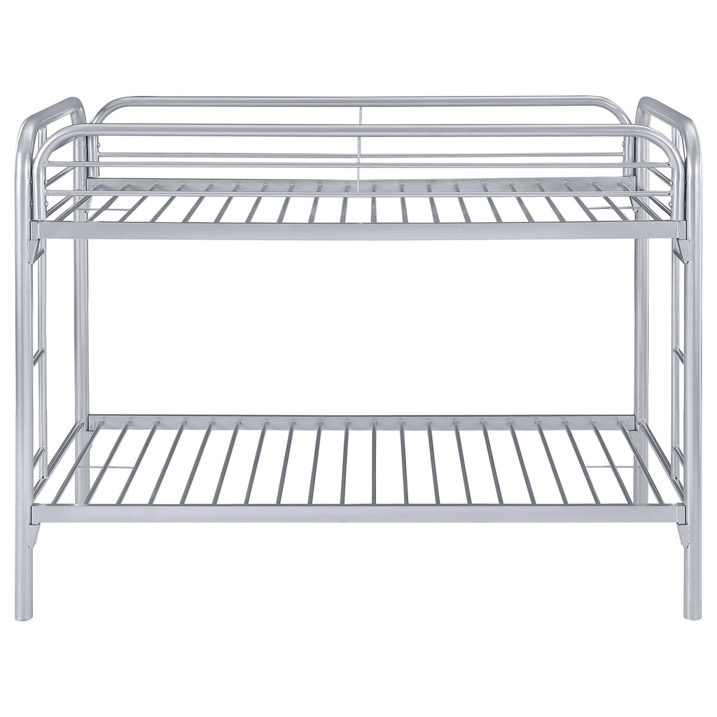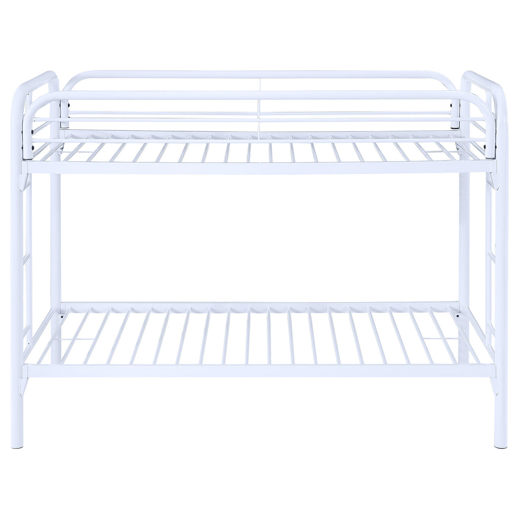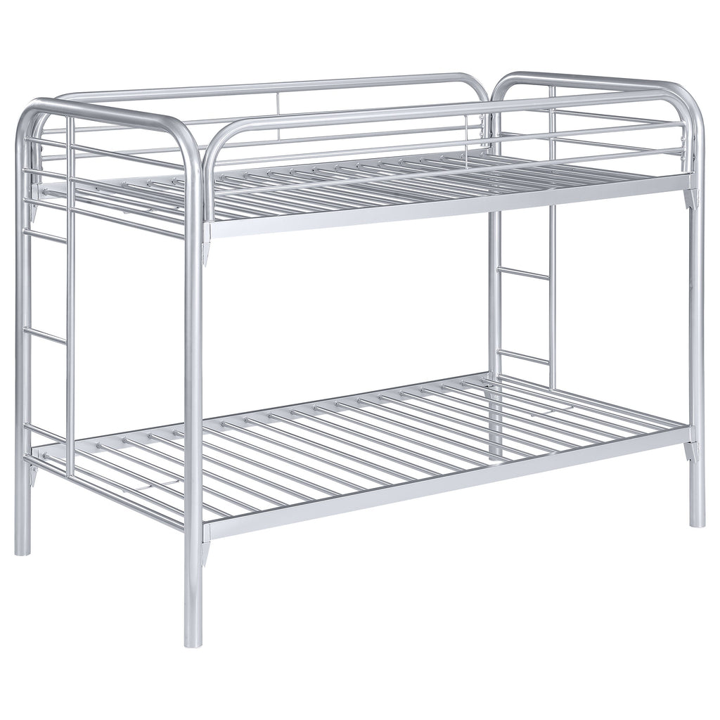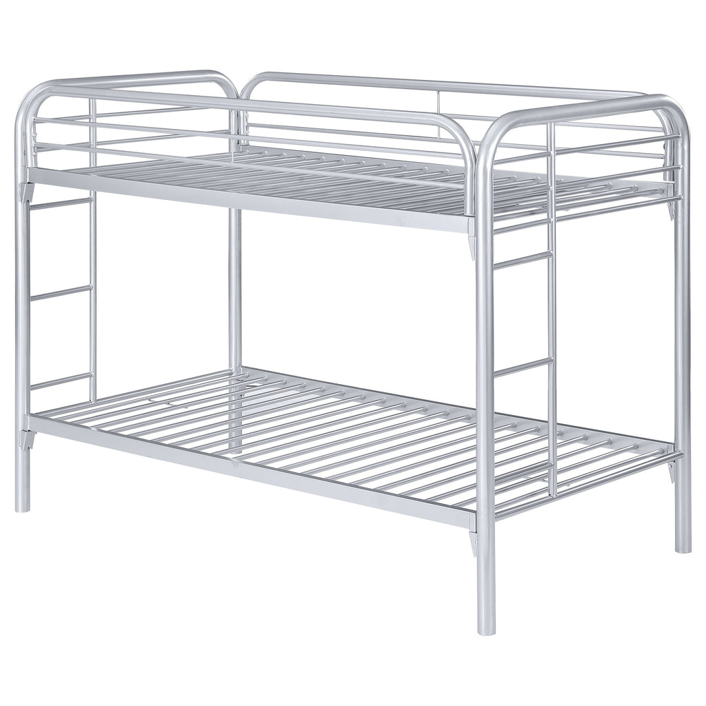 Crisp and clean, this twin bunk bed is full of sleek lines. Simplify a modern aesthetic in a small room with the built-in ladders on both sides of the frame. Open and supportive, the top bunk on this twin over twin bed features a full-length guard rail. Balance out thin and elongated metal lines with a sleek black finish. Complete a contemporary motif with modern colors and smooth features.