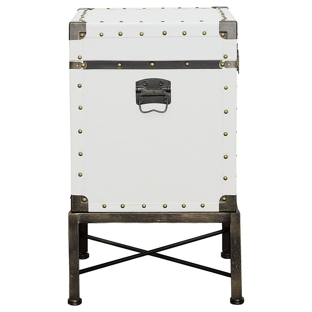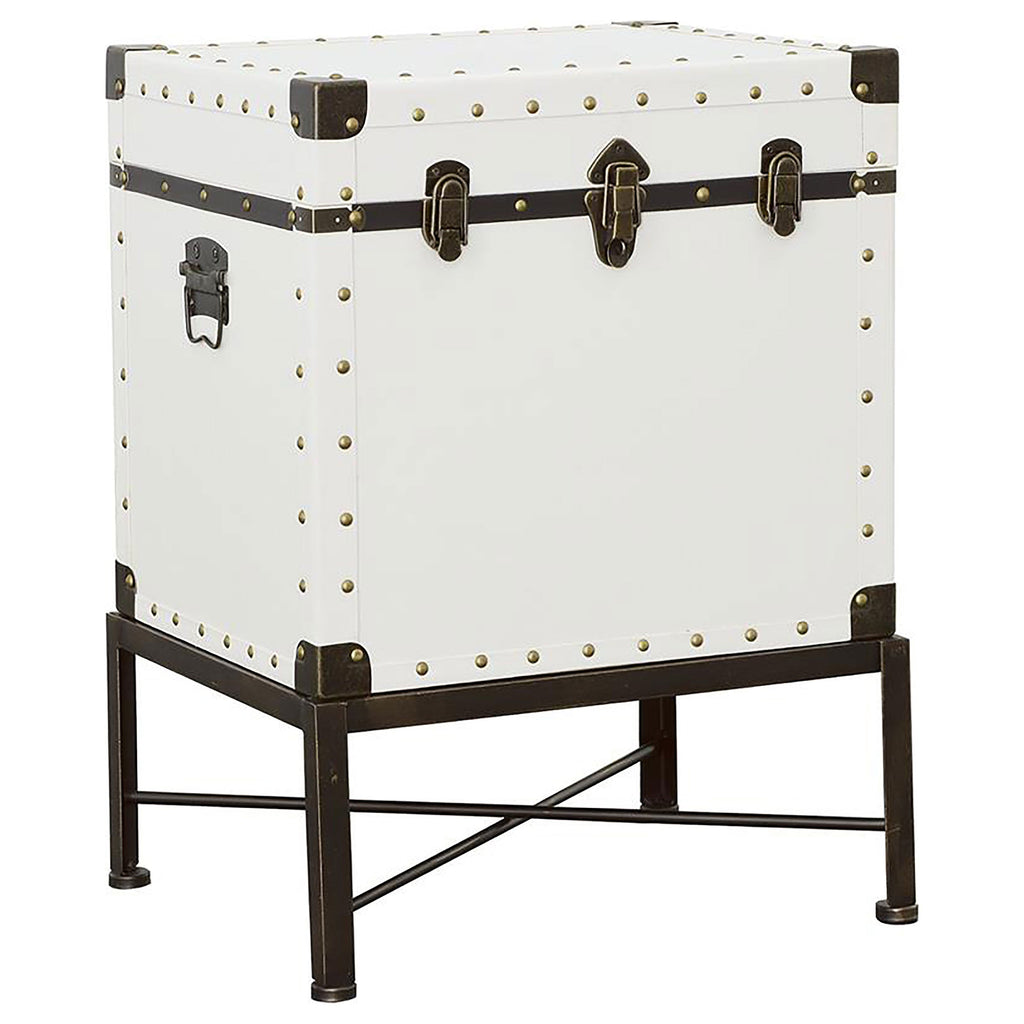 Add vintage-inspired charm to your space with this versatile side table and storage trunk combo. Upholstered in a smooth white leatherette, it features brushed brass nailhead accents for a touch of elegance. The sturdy metal base, finished in a brushed bronze tone, provides stability and complements the design. The functional trunk offers ample storage for blankets, books, or essentials. Perfect as an accent or end table, this piece blends form and function beautifully.