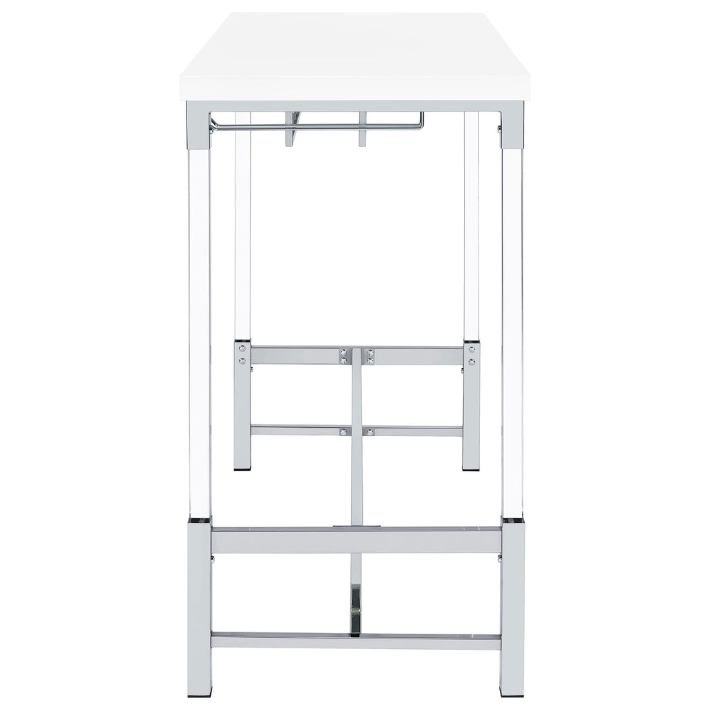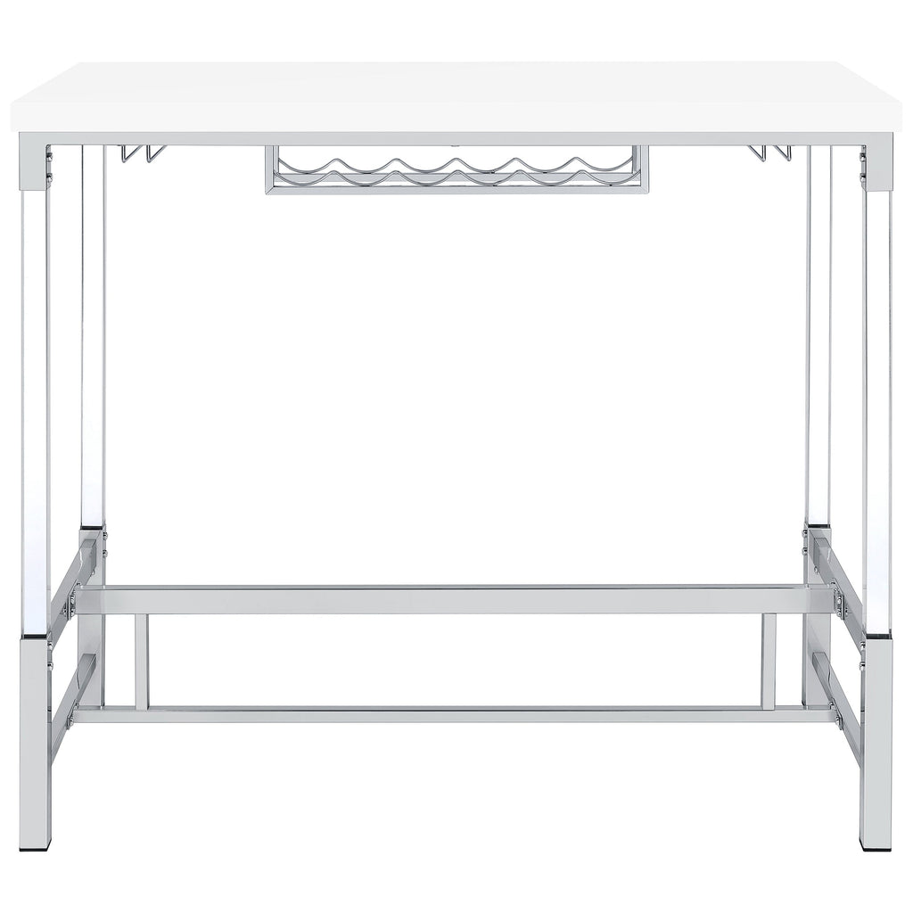 Create the ideal spot to share a bottle of wine with friends with a contemporary bar table. Perfect for two to four, it boasts a crisp, streamlined silhouette with an elevated tabletop in a bright white finish. The base features a silver finish and trestle details. Acrylic legs add a sense of light, airy ambiance, perfect for a compact nook or dining room. The table includes a built-in six-bottle wine rack and two stemware racks that make pouring a glass of your favorite vintage simple and easy.