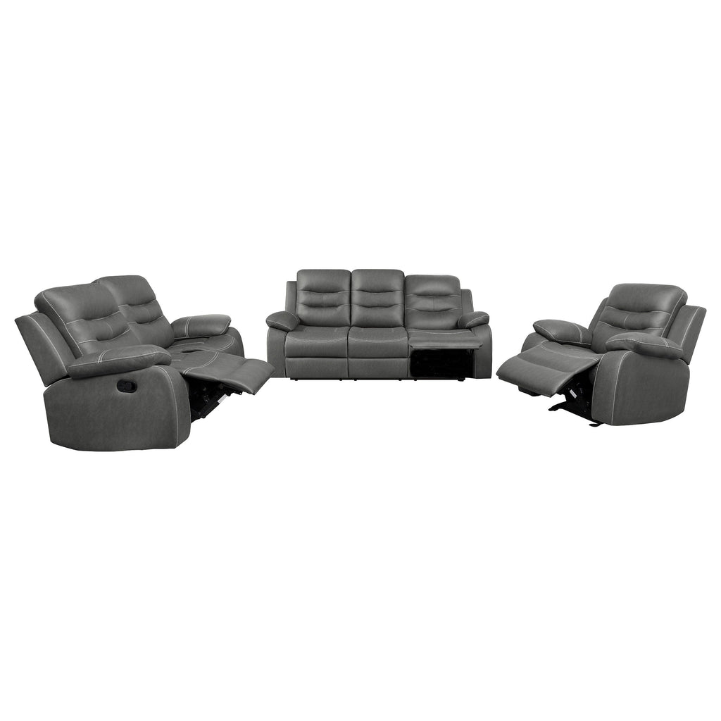 Includes: One (1) reclining sofa, one (1) reclining loveseat, and one (1) glider recliner