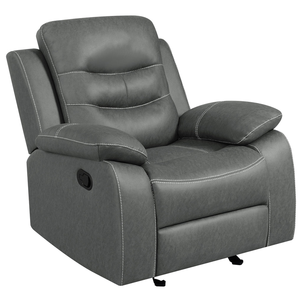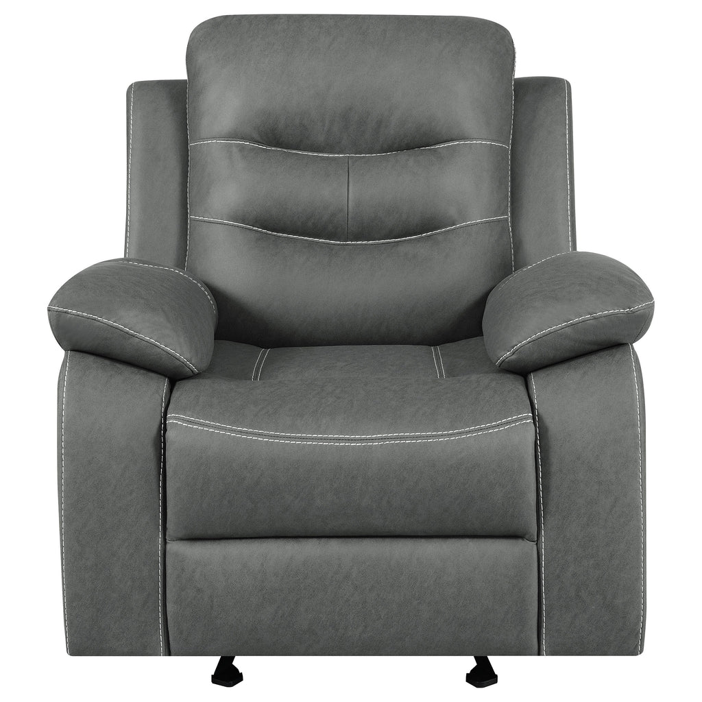Ultra-cozy in both style and seating experience, the glider recliner is ideal for entertaining or solo personal relaxation. Pillowy polyester fiber padding in all the right places supports seating comfort and offers a design boost through tufting and layering. Cool dark grey microfiber upholstery is pleasing and contemporary in a wood-framed glider recliner with pocket coil seating. Manual reclining creates customized positions for everything from socializing to napping, as a gliding motion embellishes its comfort level. A wall-hugger design saves space, making this glider recliner a good choice for both large and compact spaces.