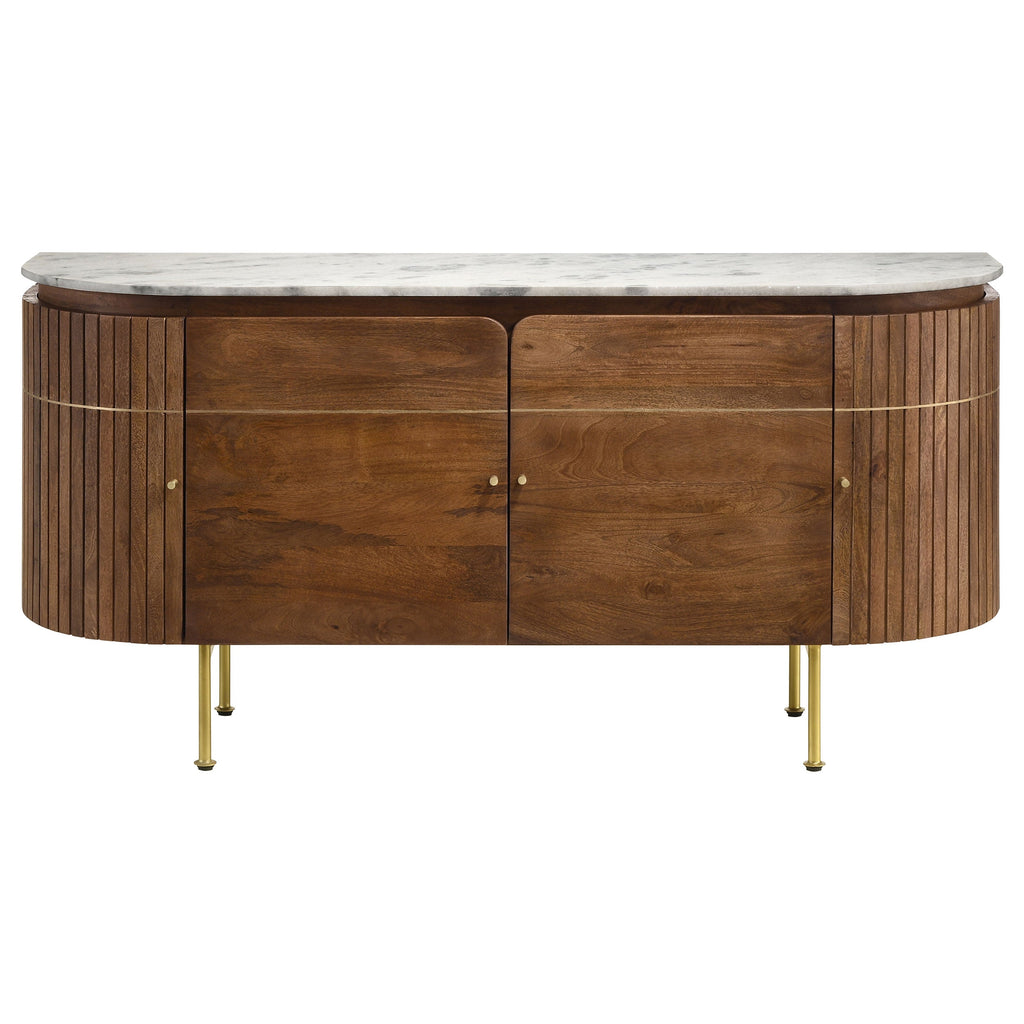 Exuding stylish personality, this contemporary server is a chic blend of mid-century and more updated design ideals. Ample interior storage is showcased behind four doors that create an oval silhouette, offering dimension and visual interest to a kitchen or dining room. The top of the server is beautiful, natural white marble that lends luxurious elegance to any setting. The case boasts beautiful mango woods construction in a warm, natural finish that lends earthy sophistication, complemented with brass inlay details for metallic shine. Vertical fluting decorates two side doors on the server, offering a perfect complement to the Ortega collection dining table.