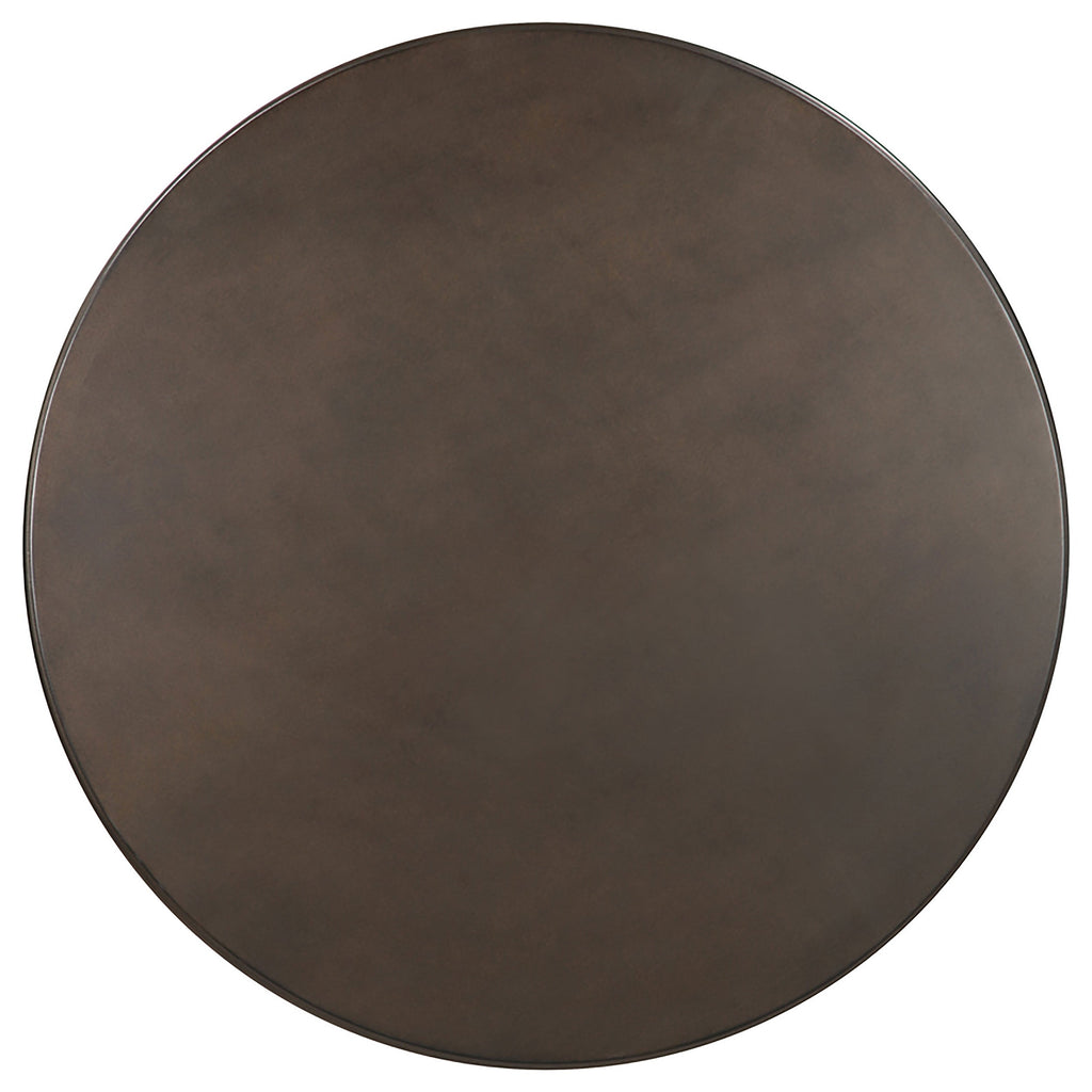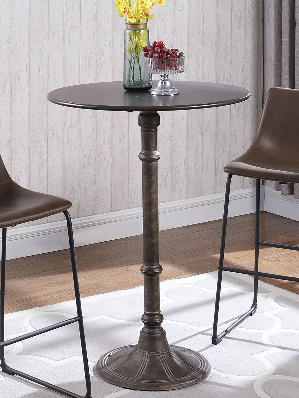 French bistro style round bar table in dark russet with metal base in antique bronze