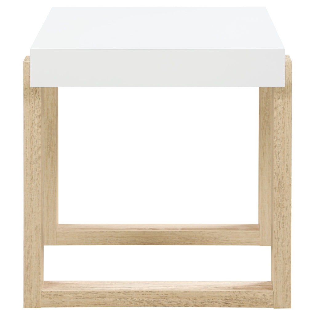 This modern end table combines a whimsical design with cheerfully bright hues. Its thick, square white high-gloss tabletop adds a minimalist aesthetic while resting on a double U-shaped base in a light natural finish. The base showcases subtle wood grain patterns, providing a charming contrast. Perfect for compact spaces, this side table serves as a functional accent piece, whether next to a sofa or an accent chair, supporting lamps, decor, or daily essentials.