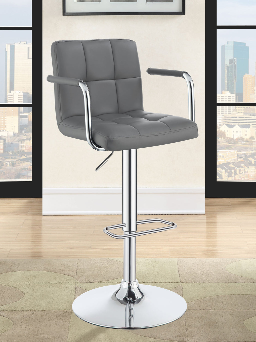 Upgrade your seating experience with this sleek hydraulic gas lift adjustable bar stool, perfect for modern kitchens or home bars. The stool features a cushioned seat with stylish tufting and a durable faux leather finish, providing both comfort and easy maintenance. Its adjustable height mechanism lets you find the perfect fit, while the chrome base and footrest add a polished, contemporary look. The integrated armrests offer added support, making it ideal for leisurely meals or casual gatherings. Enjoy both functionality and style with this versatile, high-quality bar stool.
