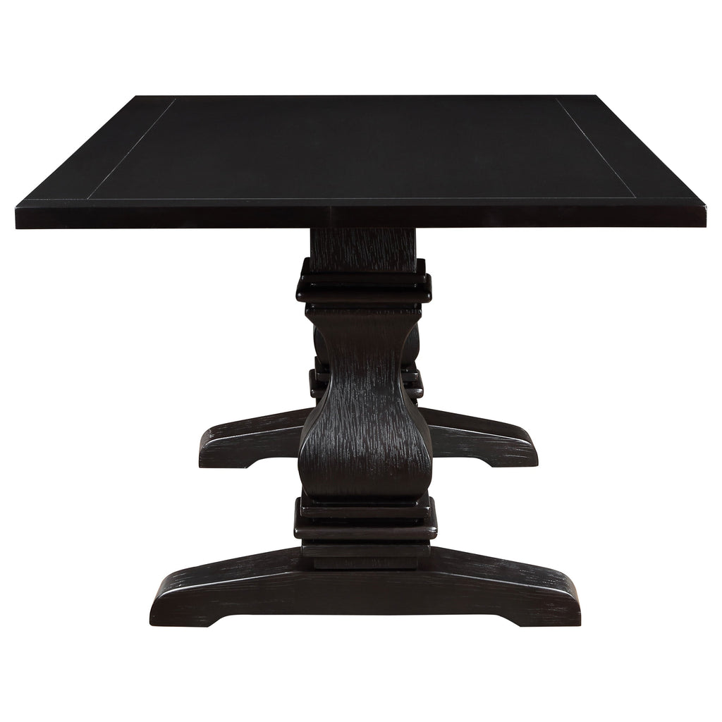 Family sized dining table has a fixed top and stout pedestal columns