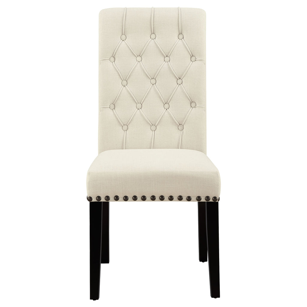 Rustic espresso wood finish is contrasted by cream color, tufted, parson side with nailhead trim