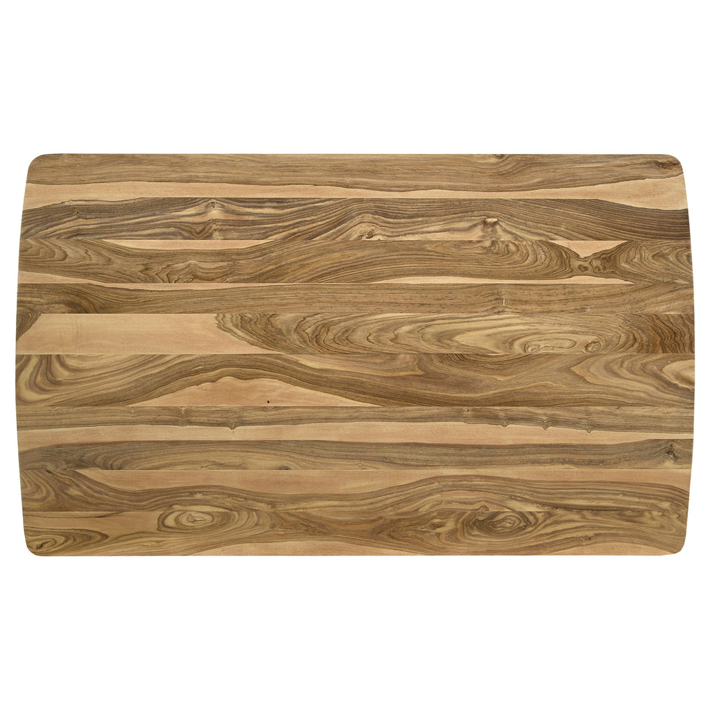 Natural finish sheesham table with spacious rectangular top and tapered, rounded legs, dark apron with geometric design detail for an exotic effect