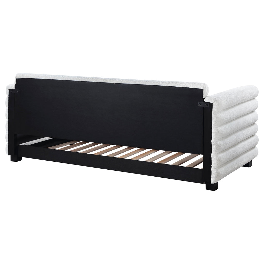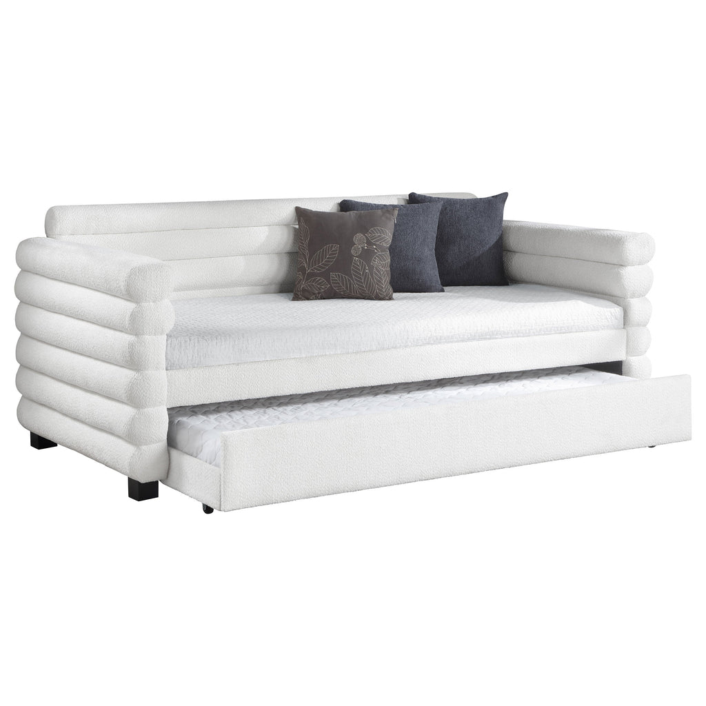 You're going to love the intriguing silhouette and boucle upholstery featured on this modern daybed and trundle. Offering contemporary flair, the daybed is designed with layered round bolsters, creating exceptional texture and dimensionality in your living room or den. Boucle upholstery is fresh and modern, creating inviting texture and character. The bed and trundle are twin-sized, offering easy lounging on a daily basis, or creating space for a pair of overnight guests. This stylish daybed offers the perfect combination of impressive style and wonderful versatility.