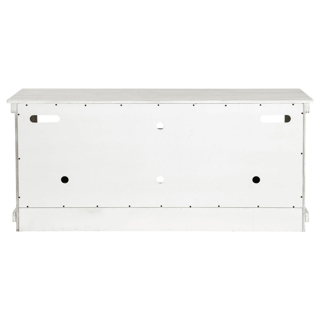 Complete a media center in your inviting home with a modern farmhouse TV stand. It's an approachable design with roughhewn wood details that create texture and dimensionality in your living space. Two shelves and 6 compartments create ample storage, perfect for everything from peripherals and accessories to personal decor. The media console features a clean-lined silhouette with a slim profile, perfect for a flat panel or wall-mounted television. This TV stand accommodates televisions up to 65 inches.