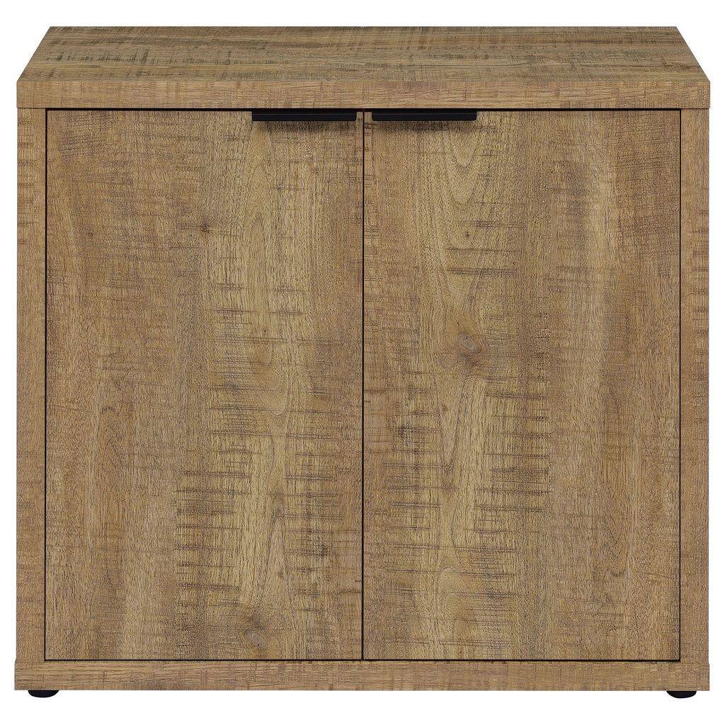 Two-door accent cabinet featuring distinctive industrial-style hardware