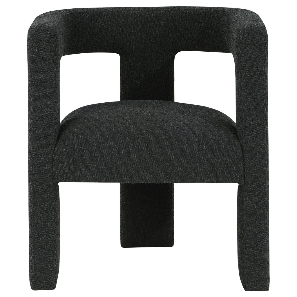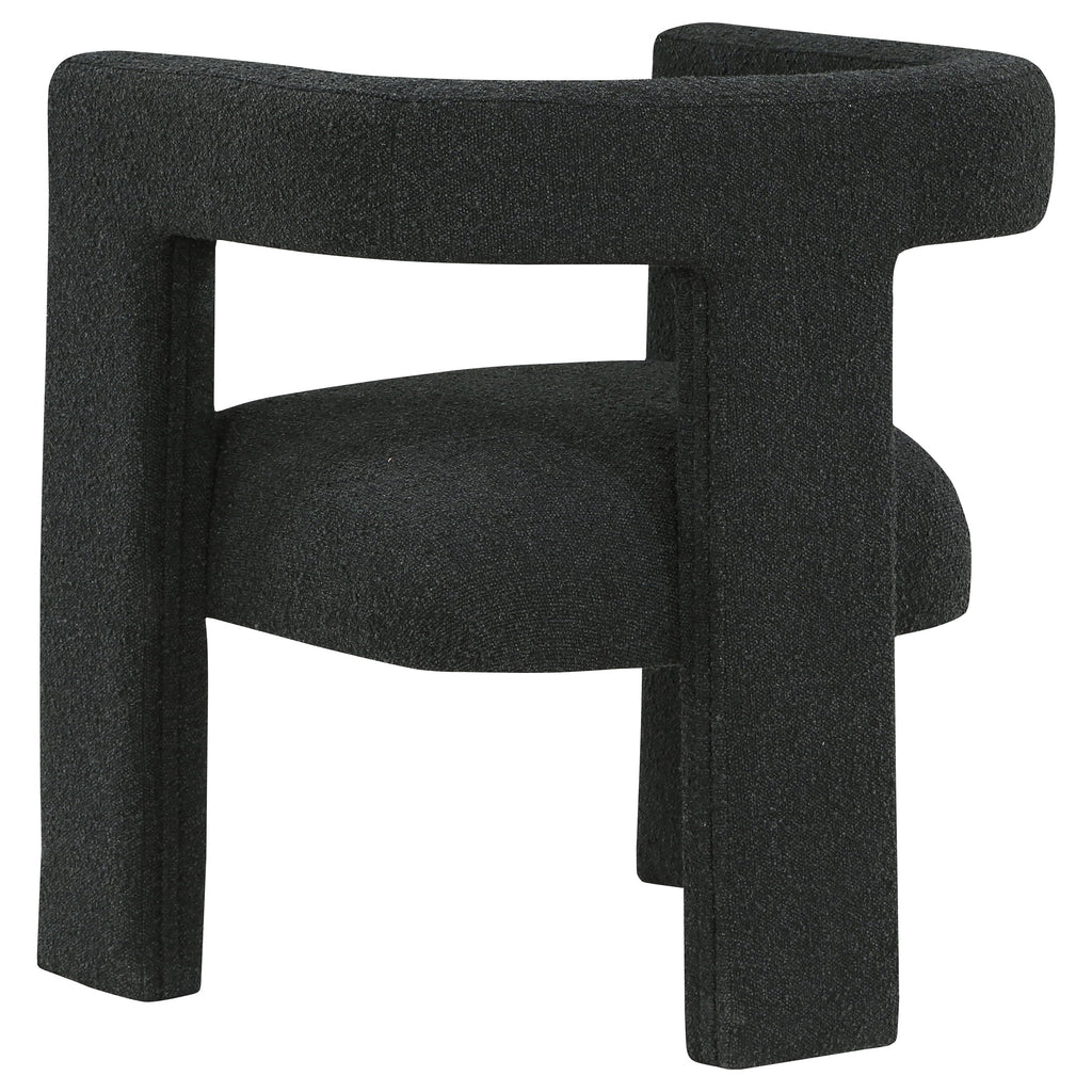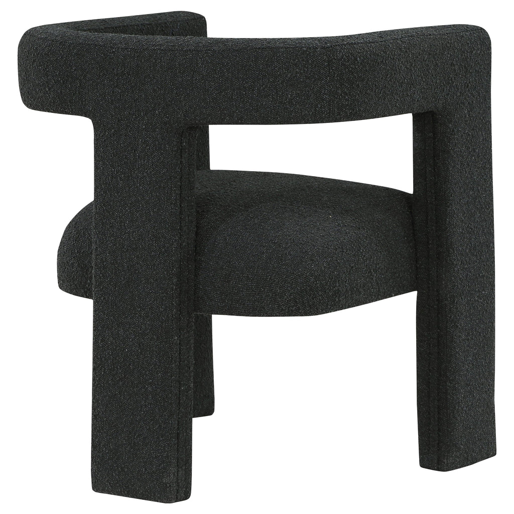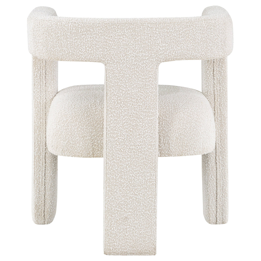 Enveloped entirely in the embrace of plush bouclé, this chair redefines the art of relaxation with its all-fabric design. The seamless transition from the cushioned seat to the curved arms, all robed in the same soft fabric, creates a cocoon of comfort. This chair's silhouette is a gentle wave of tranquility, its form an ode to the curves found in nature. The uninterrupted bouclé upholstery invites a serene tactile experience, transforming the chair into a modern sanctuary. It's a haven of softness, a singular statement of elegance and ease.