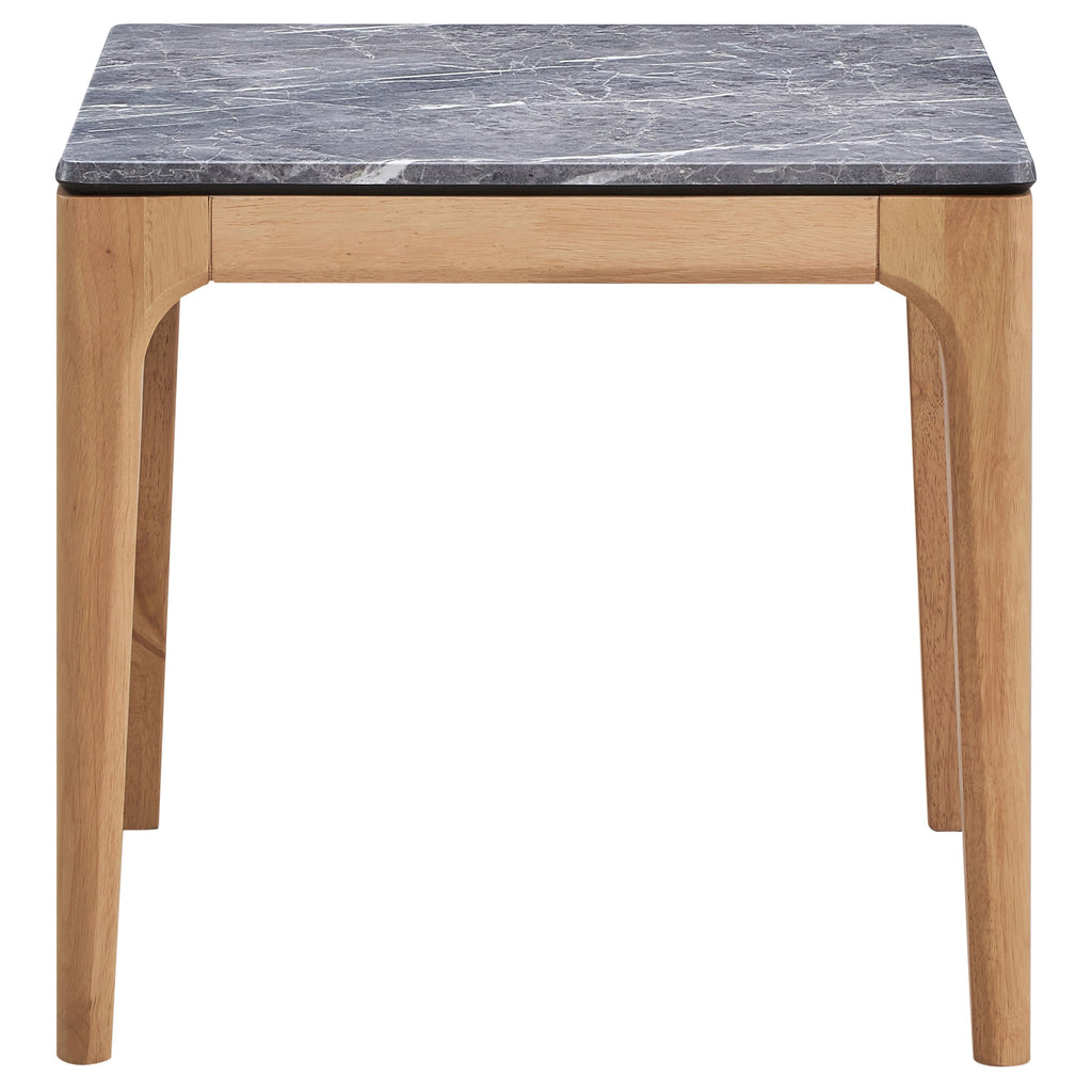 This coffee table set, inspired by mid-century modern design, includes both a rectangular coffee table and square end table. Each piece features a high-pressure laminate top in a faux marble finish, offering the luxurious appearance of marble without the heavy weight. The natural brown base complements the cool grey hues of the faux marble, creating a sophisticated contrast that embodies clean, functional beauty. Both tables are perfect for enhancing your living space with style and practical utility.