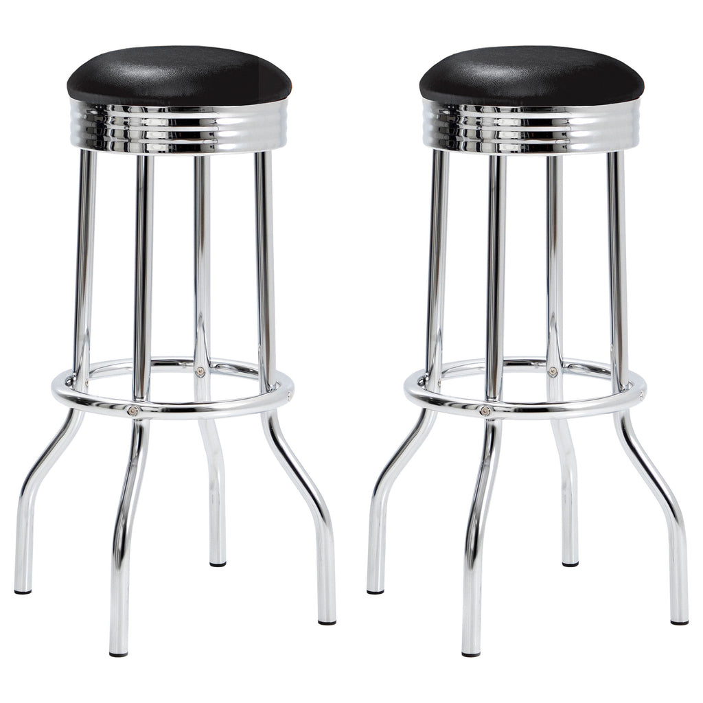 This bar stool takes you back to the 50s, the era of soda fountains and roller-skating servers. Stool comes with cushioned black leatherette seats. Thick round footrest to rest your black-and-white saddle shoes while sipping an ice cream float. With chrome seat rim and legs to complete the effect. Chrome plated '57 Cadillac with whitewall tires not included.