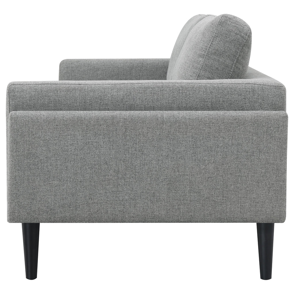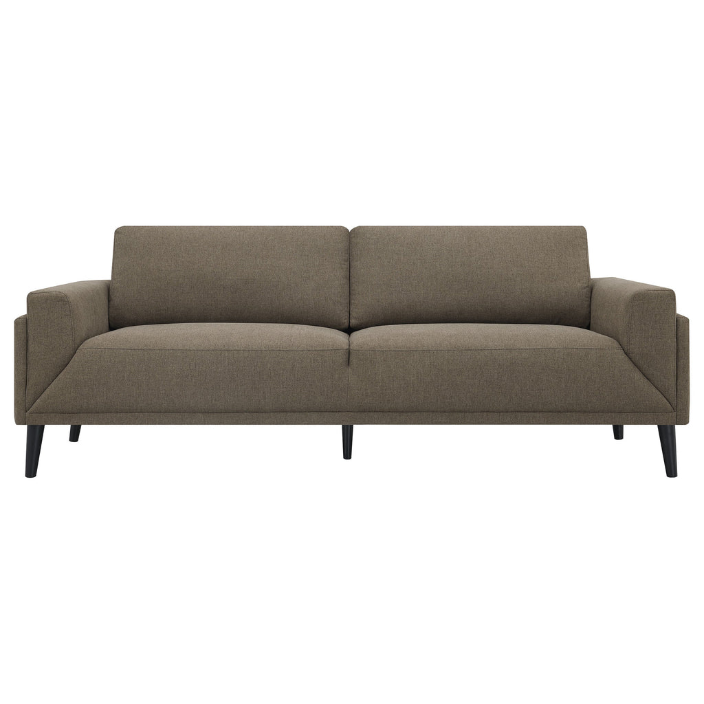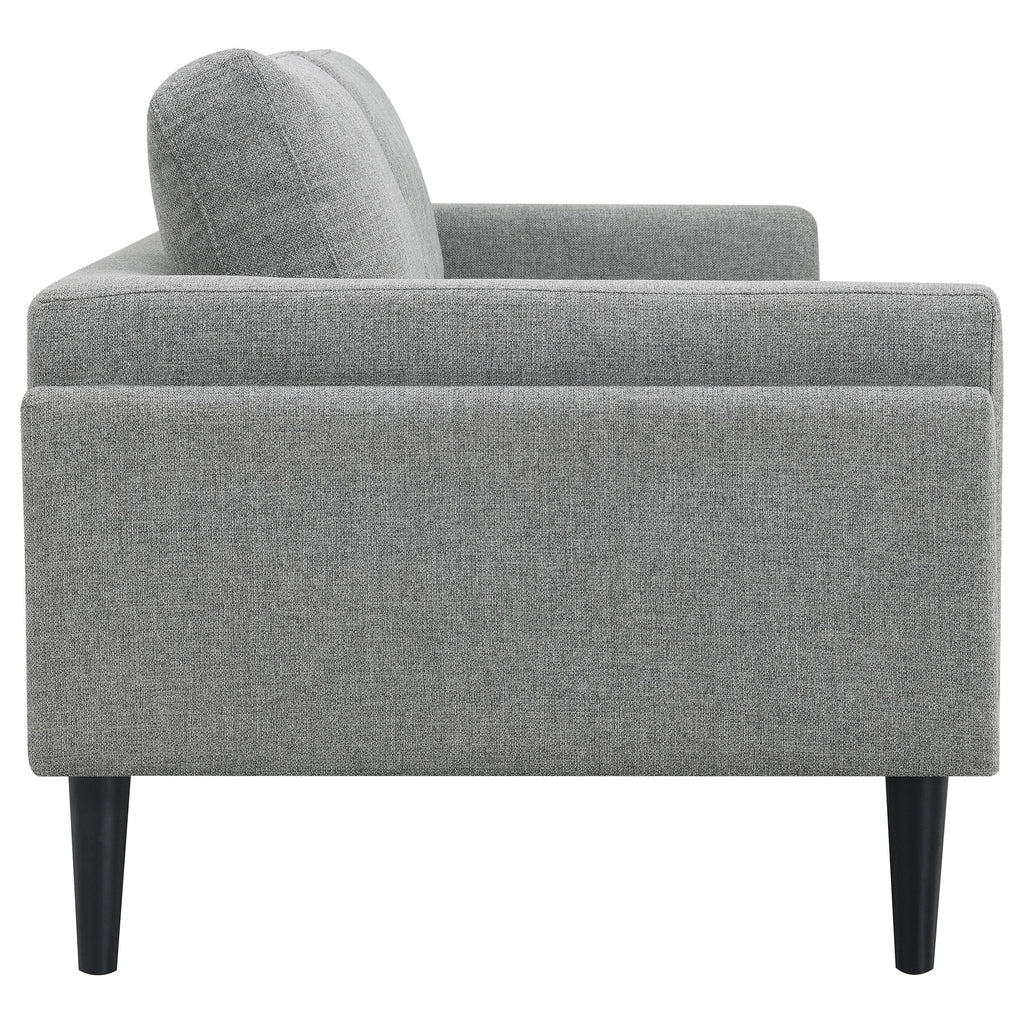 Unveiling our modern sofa, where innovation meets elegance in a frame within a frame design. Adorned in a chic fabric, its streamlined silhouette is highlighted by meticulous topstitch details and track arms complemented by mitered front accents. Prioritizing comfort, the sofa comes with reversible back cushions and pocket coil seat construction, ensuring a snug and supportive seating experience. Anchored by tall, black cylinder-shaped wooden legs, this sofa stands as a blend of style and function, ready to be the centerpiece in any contemporary living space.