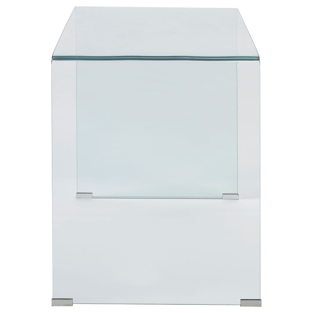 Combine modern design and minimalist construction for a writing desk that's sure to please. It features a clear tempered bent glass as the table top and solid-piece legs/stand. Chromed steel floor protectors offer practicality and stability as well as a touch of lustrous panache. Table top is large enough to accommodate a widescreen monitor and table lamp. A perfect writing desk for writing with a city view or overlooking a countryside landscape.