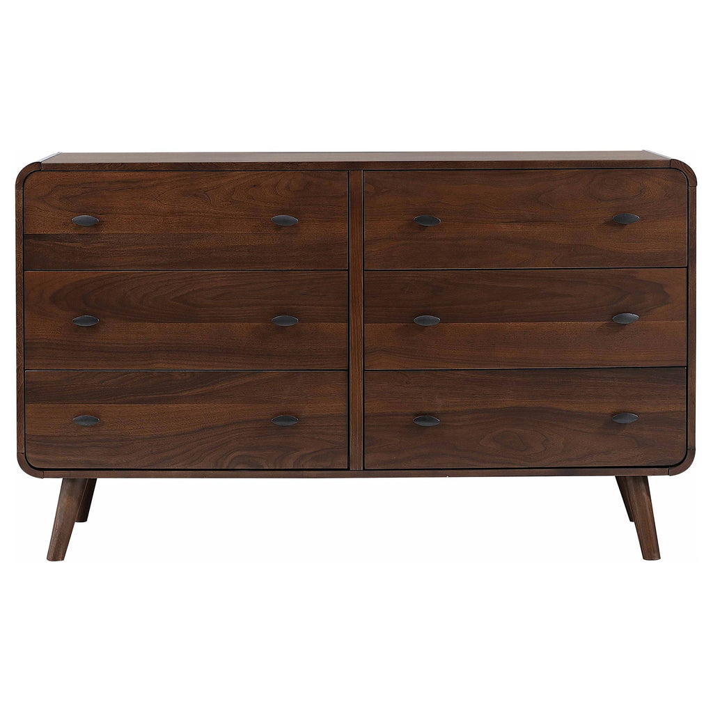Achieve the perfect blend of style and functionality with this mid-century modern dresser and mirror set. The dresser, constructed with pine, engineered wood, and walnut veneer, features six spacious drawers with felt-lined top drawers for organizing wardrobe essentials. Rounded edges, tapered legs, and a clean silhouette highlight the retro-modern appeal of this timeless duo. The matching mirror completes the set with its sophisticated design and polished details.