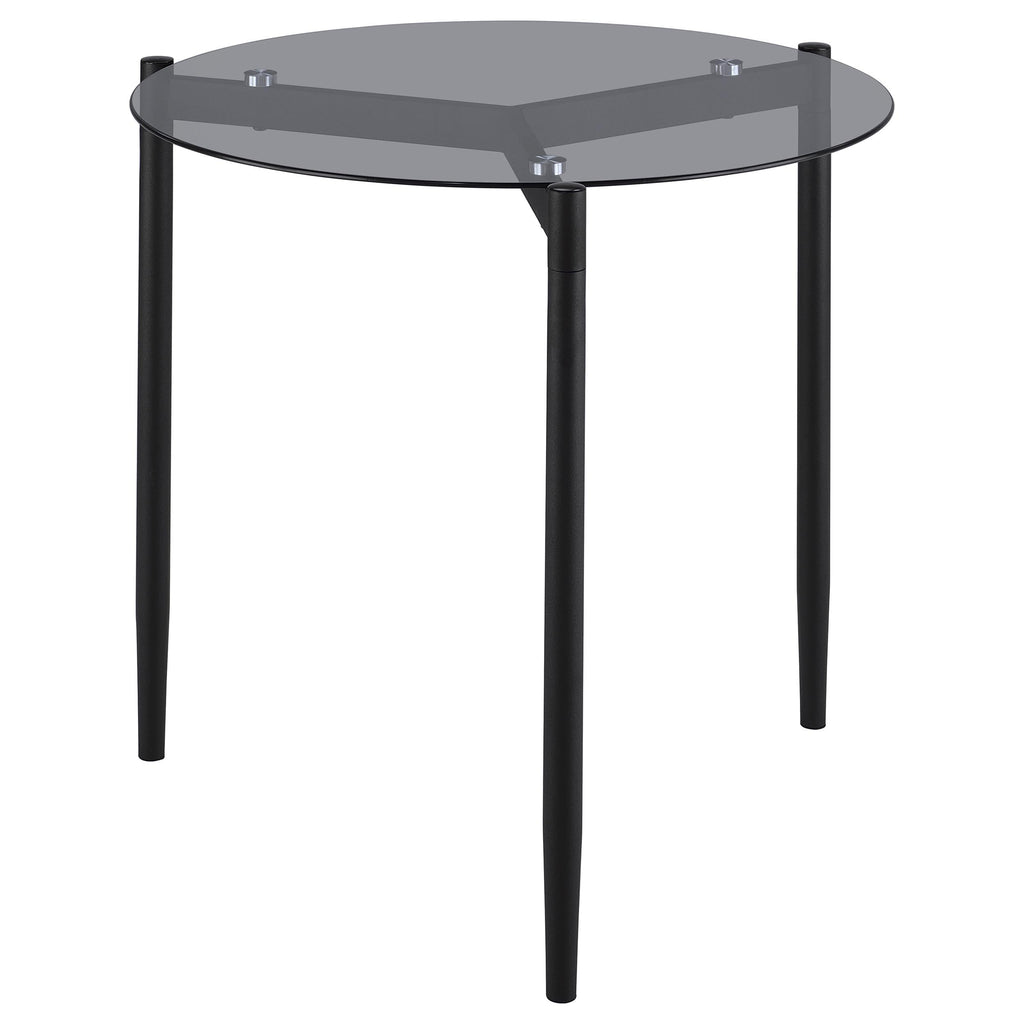 This contemporary end table showcases a tempered smoked glass top that brings both style and durability to your living space. Supported by a sturdy metal base with a black powder-coated sandy texture, it offers a sleek and modern look. Ideal as an accent or side table, its compact round design fits effortlessly into any room. The minimalist construction and refined materials make it a versatile piece for modern interiors.