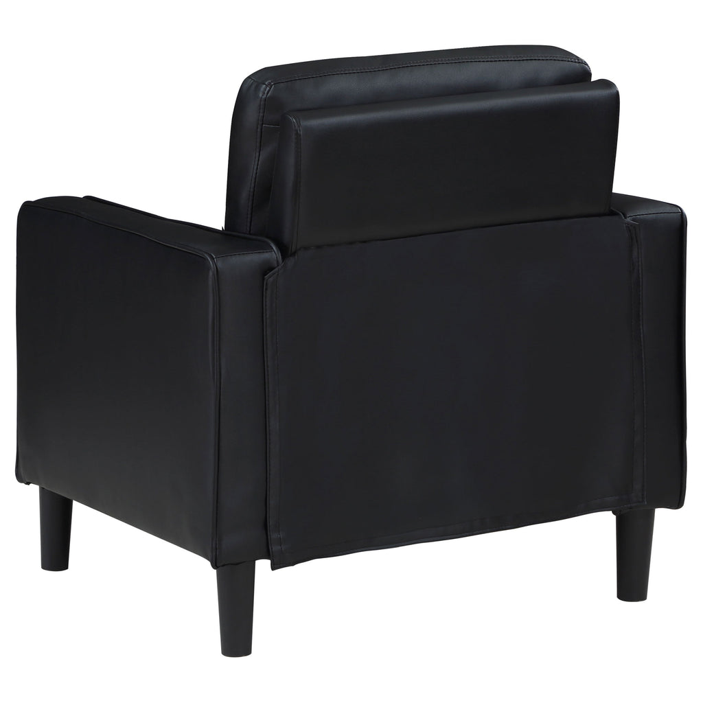 Black faux leather upholstery adds a bold, modern touch to any space