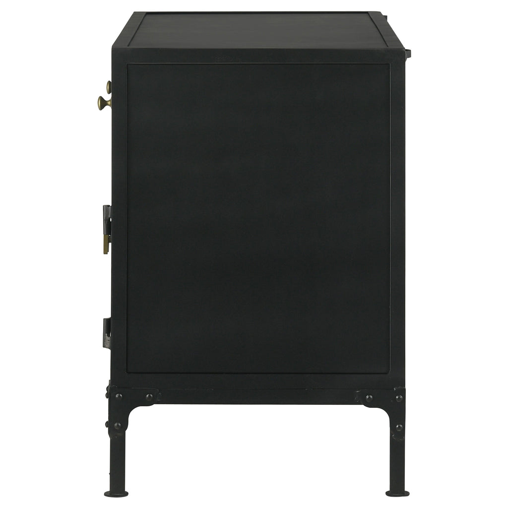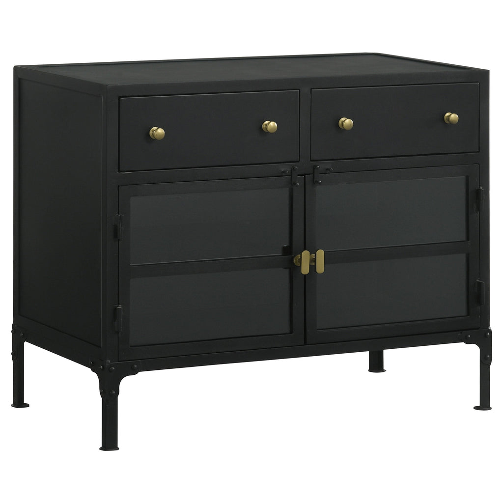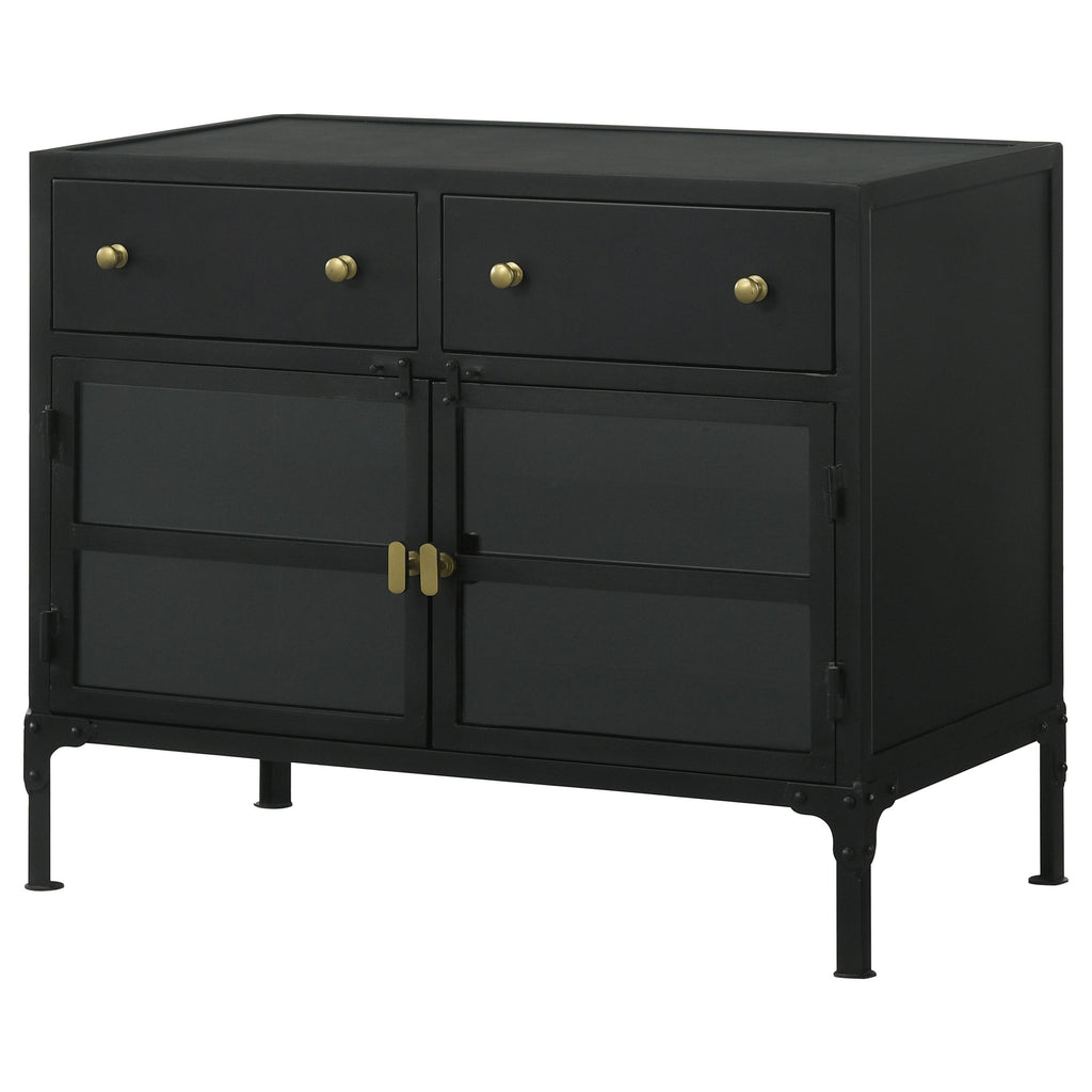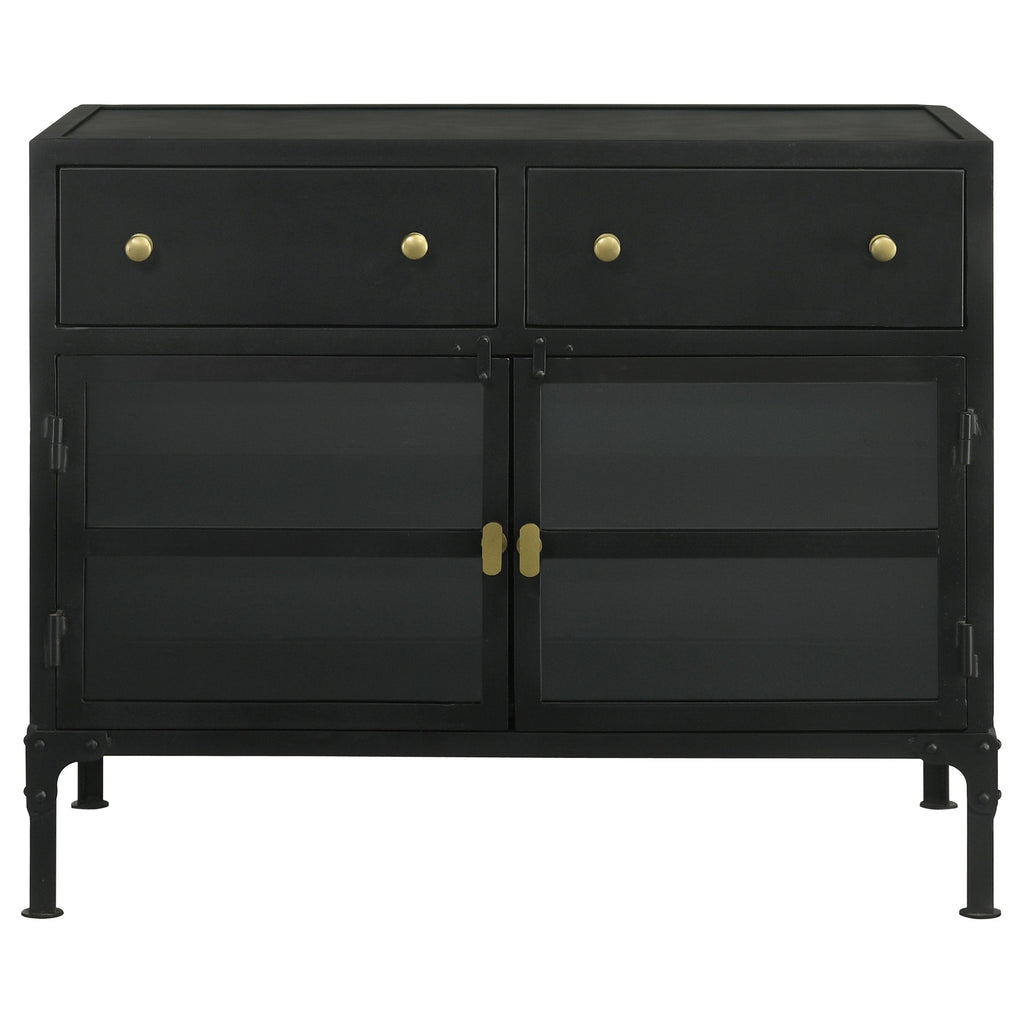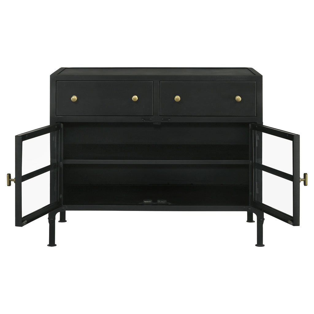 Industrial inspired accent cabinet features a matte black metal finish and tempered glass