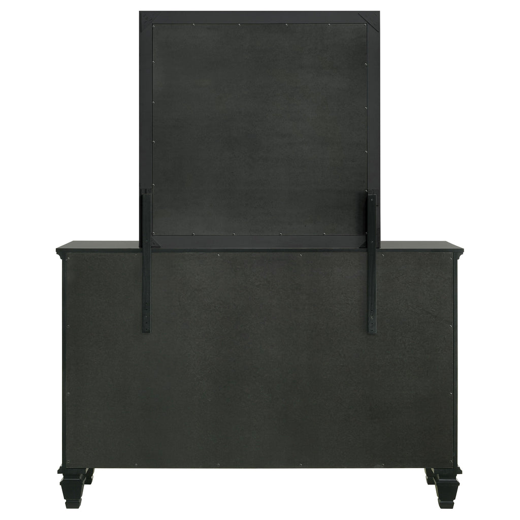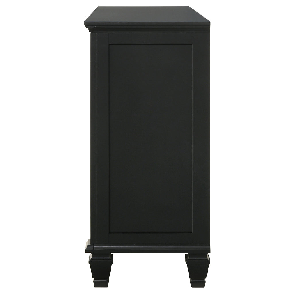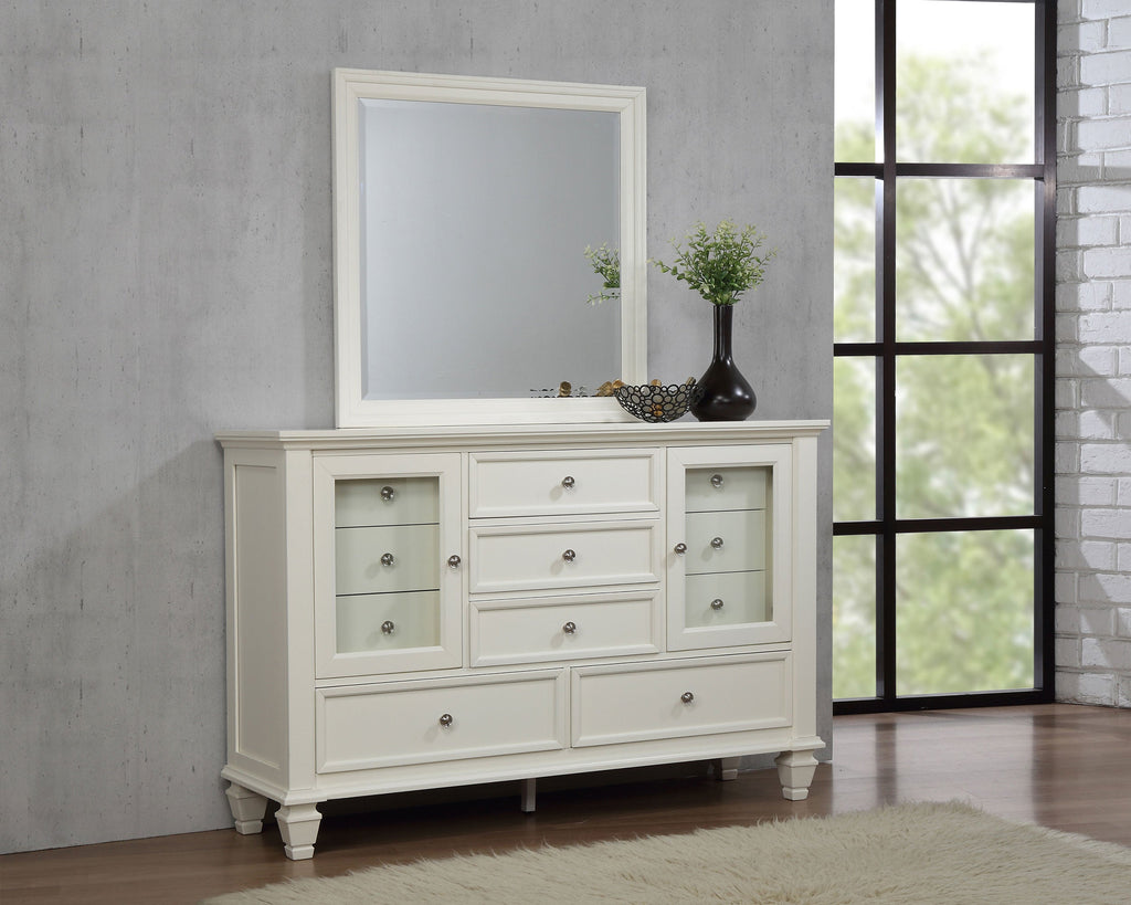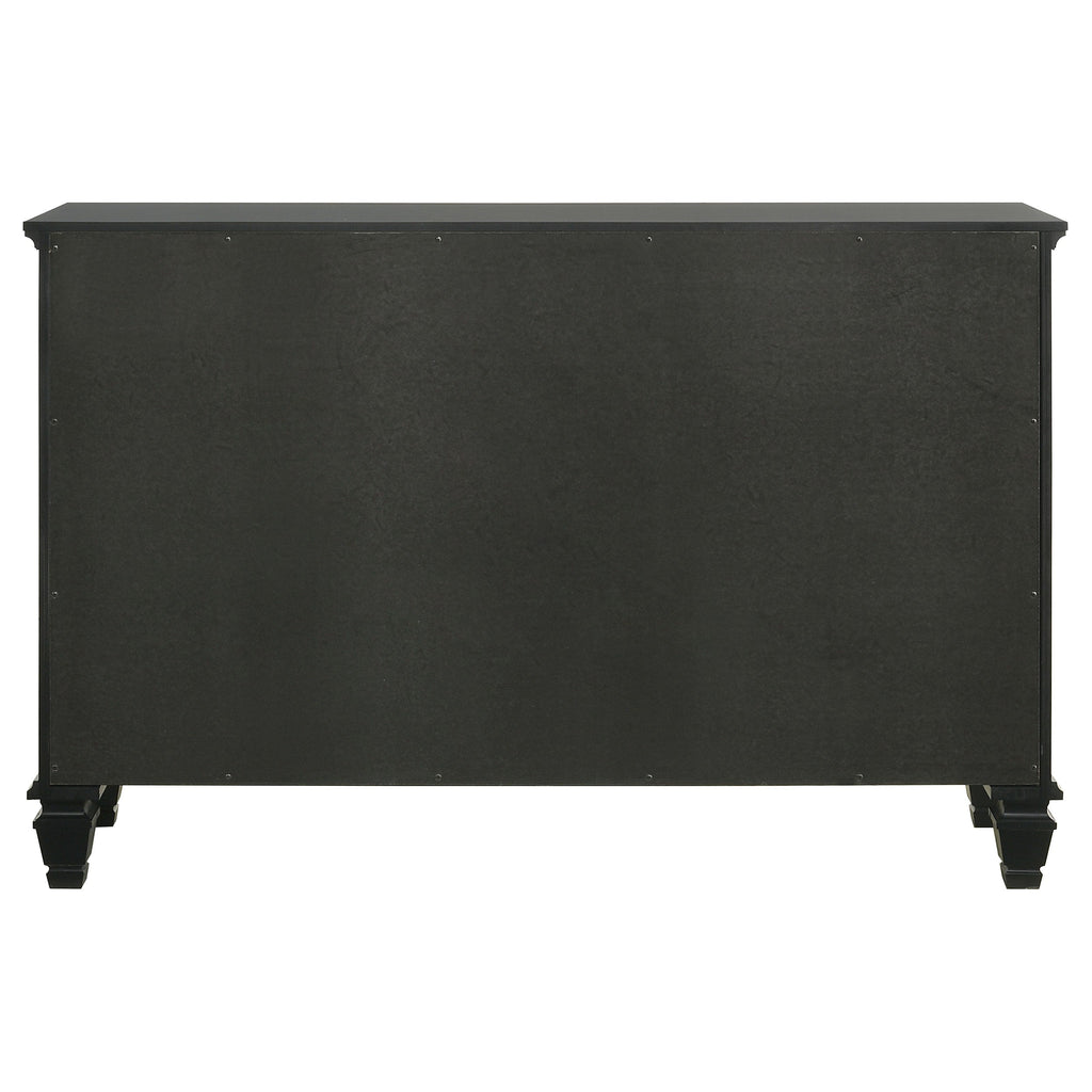 Dresser features two wood-framed tempered glass doors and eleven spacious drawers for ample storage