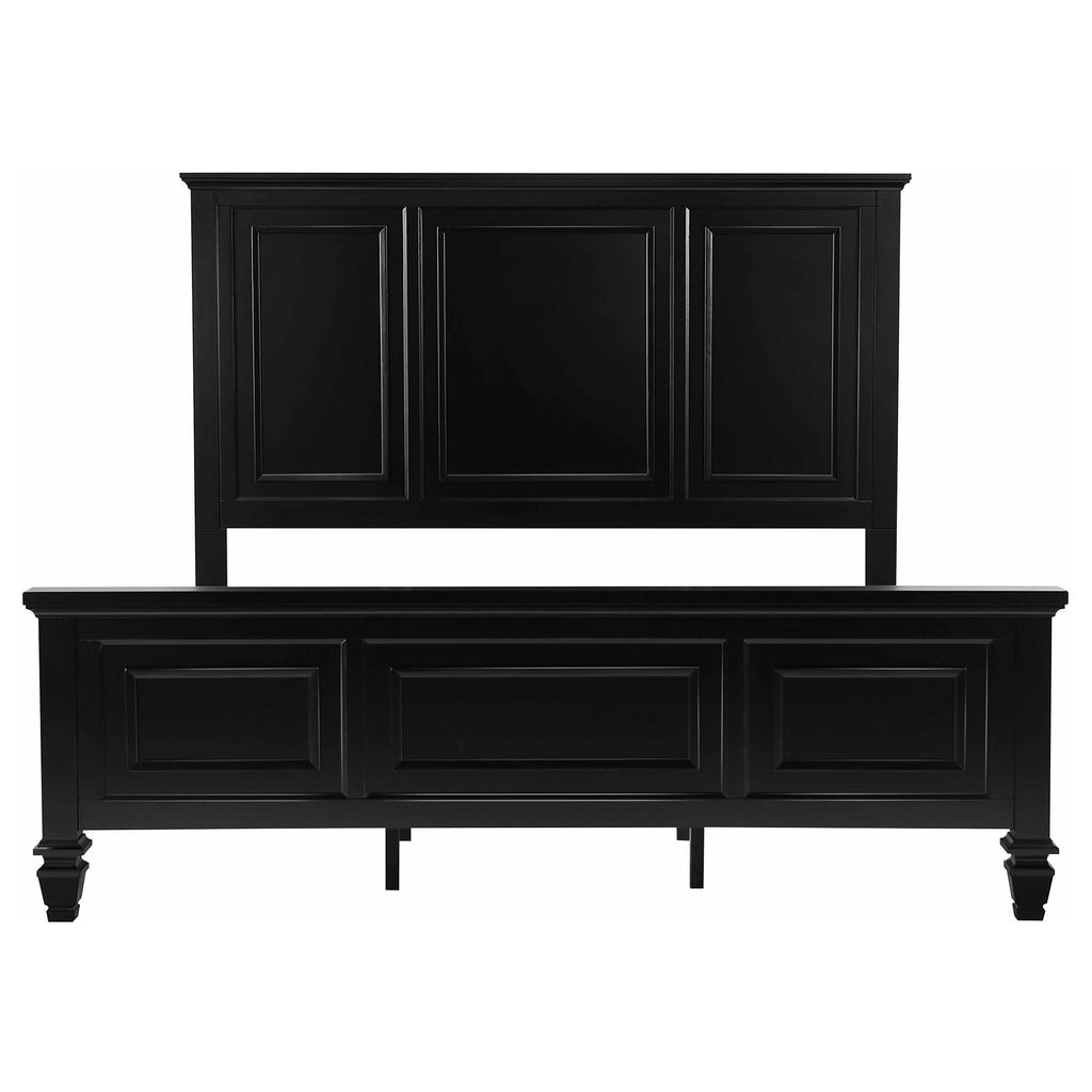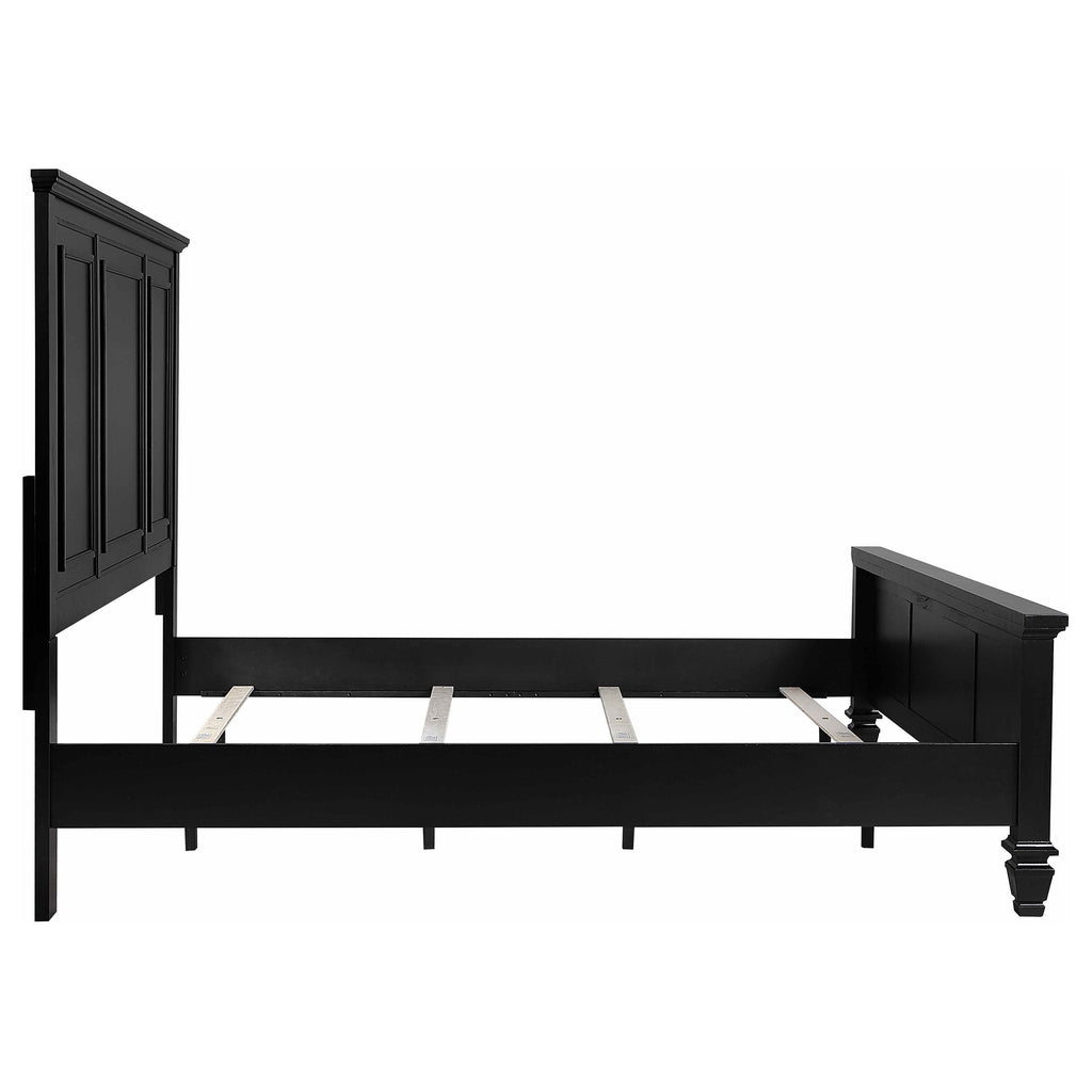 California king panel bed featuring intricately carved panels on the headboard and footboard for classic charm